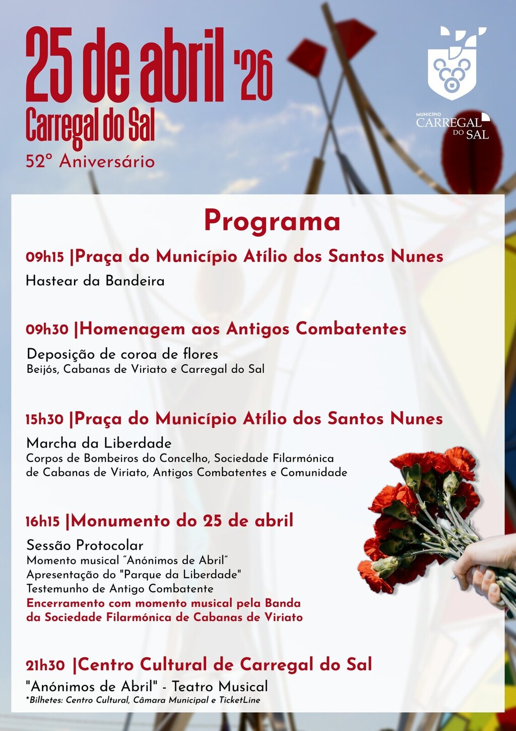 O Município de Carregal do Sal vai assinalar o 52.º aniversário do 25 de Abril de 1974 com um conjunto de iniciativas evocativas da Revolução dos Cravos, que terão lugar ao longo do dia 25 de abril de 2026.
