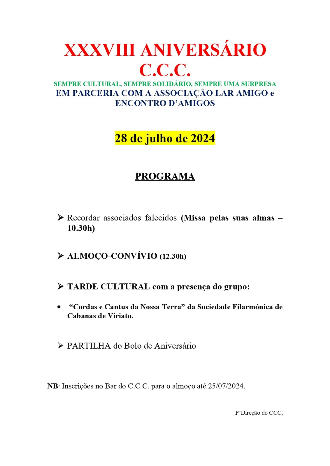 NB: Inscrições no Bar do C.C.C. para o almoço até 25/07/2024.