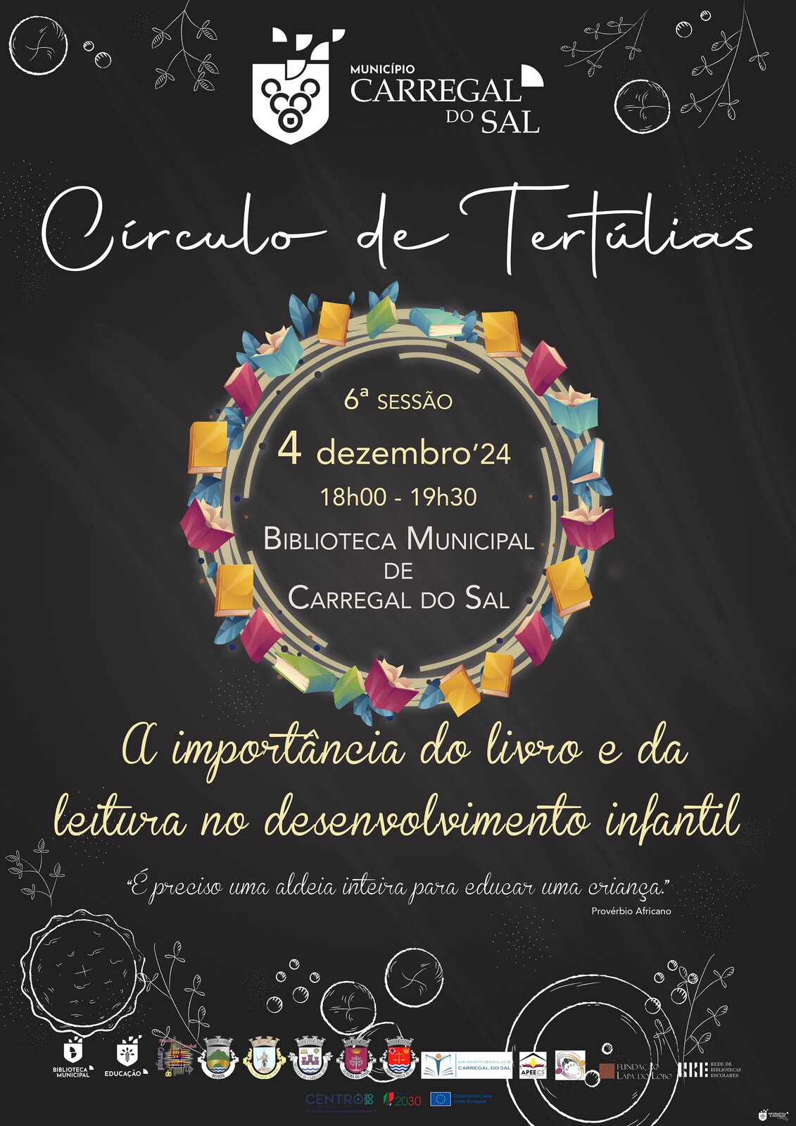 Subordinada à importância do livro e da leitura no desenvolvimento infantil, a sessão número seis do Círculo de Tertúlias é realizada em estreita colaboração com a Rede Interconcelhia de Bibliotecas Escolares, no âmbito do Projeto “Bichinho(s) de Leitura” e destina-se a toda a comunidade e, em especial aos Pais e Encarregados de Educação.
