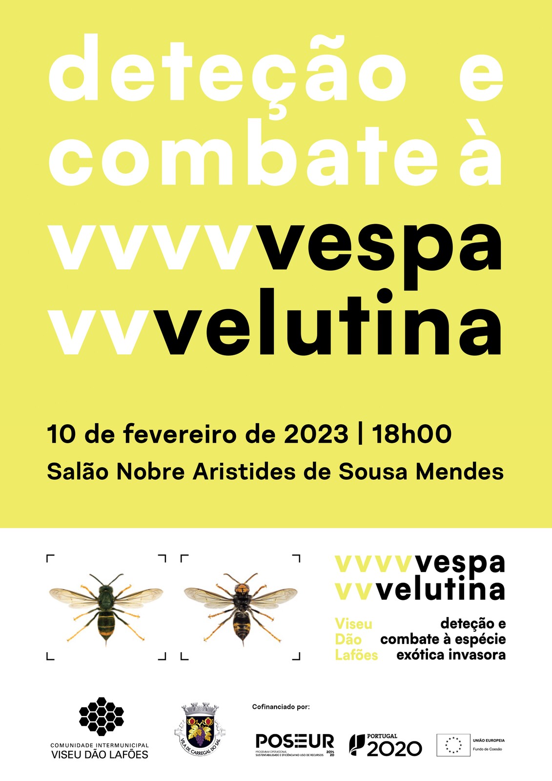 Promovida pela Comunidade Intermunicipal Viseu Dão Lafões - CIMVDL, no âmbito de uma candidatura aprovada pelo Programa Operacional da Sustentabilidade e Eficiência no Uso de Recursos – POSEUR, a ação tem como principal objetivo transmitir informações com o intuito de melhorar o conhecimento da população da região quanto a comportamentos e procedimentos a adotar quando detetada a presença da espécie exótica invasora Vespa velutina.