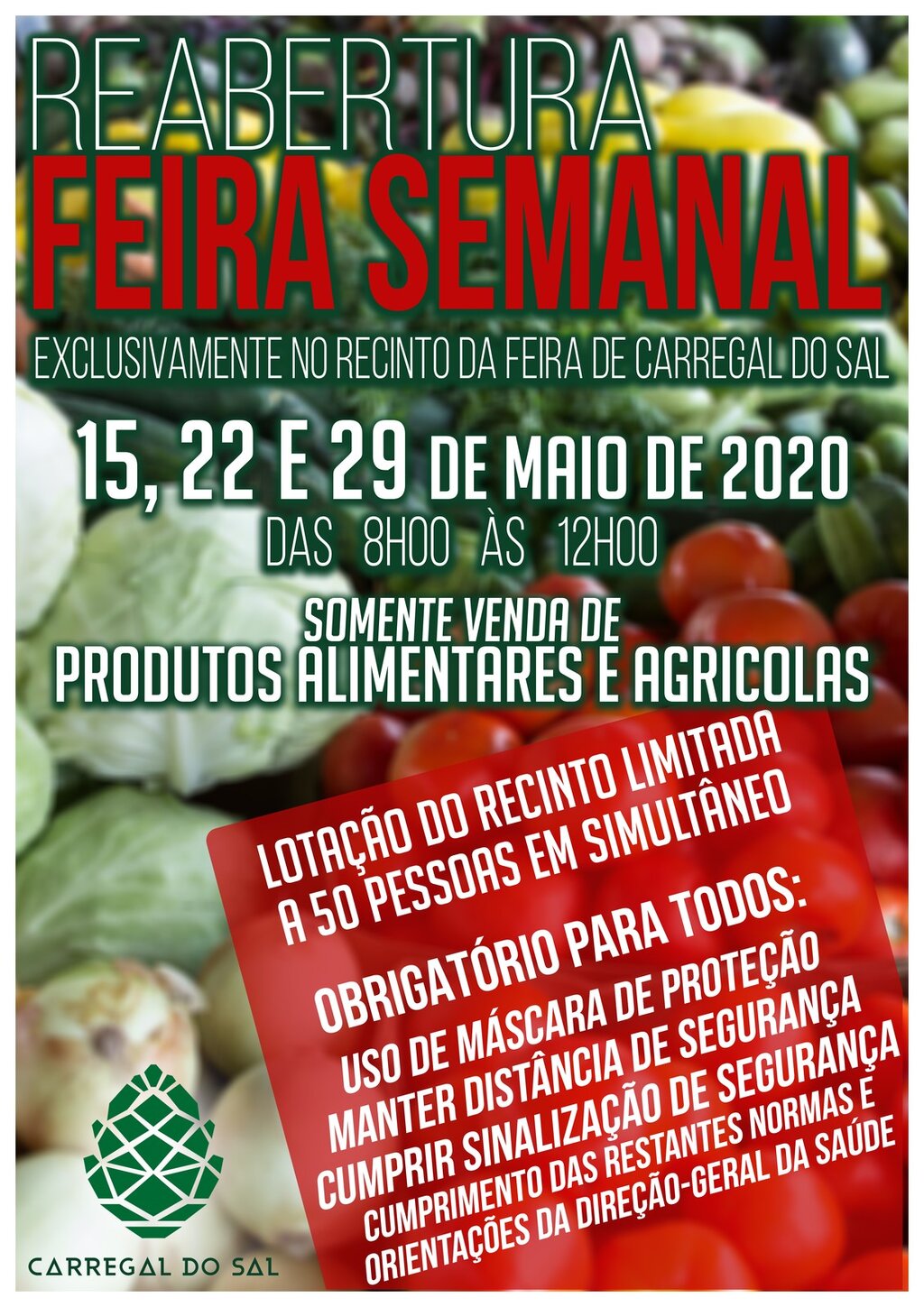 Somente Venda de Produtos Alimentares e Agrícolas com lotação do recinto limitada a 50 pessoas em simultâneo.