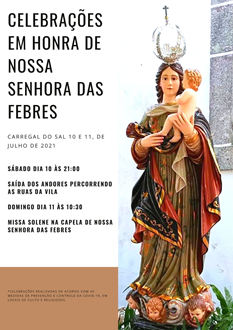 No domingo dia 11 de Julho será celebrada a Missa Solene em Honra de Nossa Senhora das Febres, no espaço exterior da capela com ínicio às 10:30 horas, esta celebração decorrerá de acordo com as Medidas de Prevenção e Controle do COVID-19, em Locais de Culto e Religiosos, impostos pela Direção Geral da Saúde.