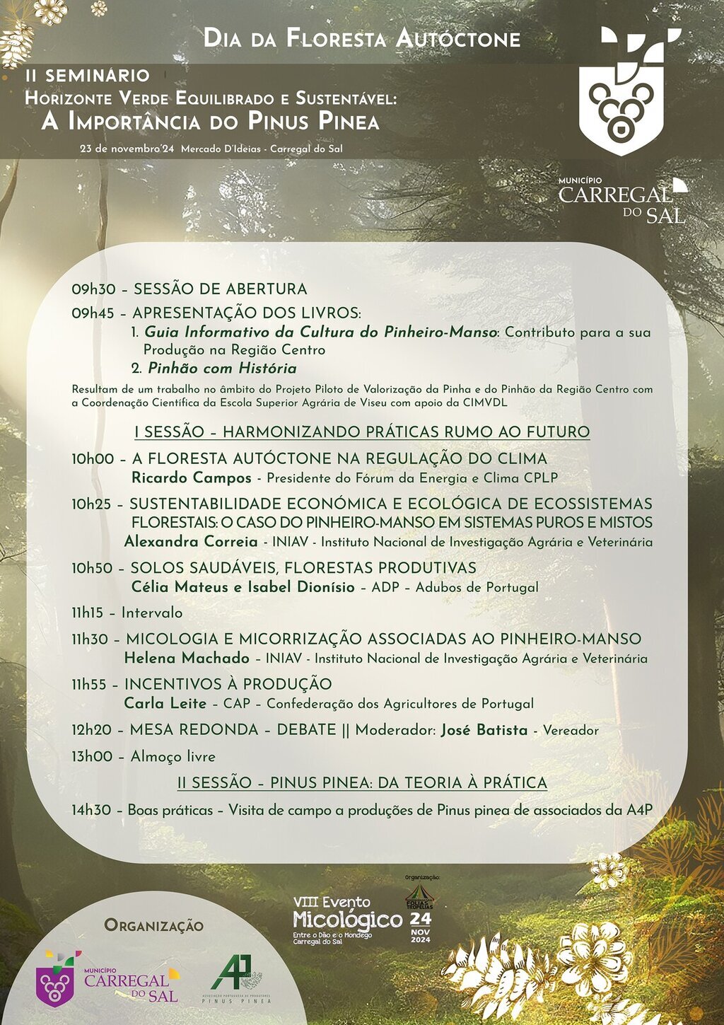 O Município de Carregal do Sal com o foco no clima, na floresta e na sustentabilidade de recursos, bem como na interligação entre estes, em parceria com a A4P – Associação Portuguesa de Produtores de Pinus pinea, vão realizar, no próximo dia 23 de novembro o seminário “Horizonte Verde, Equilibrado e Sustentável: A Importância do Pinus pinea”.