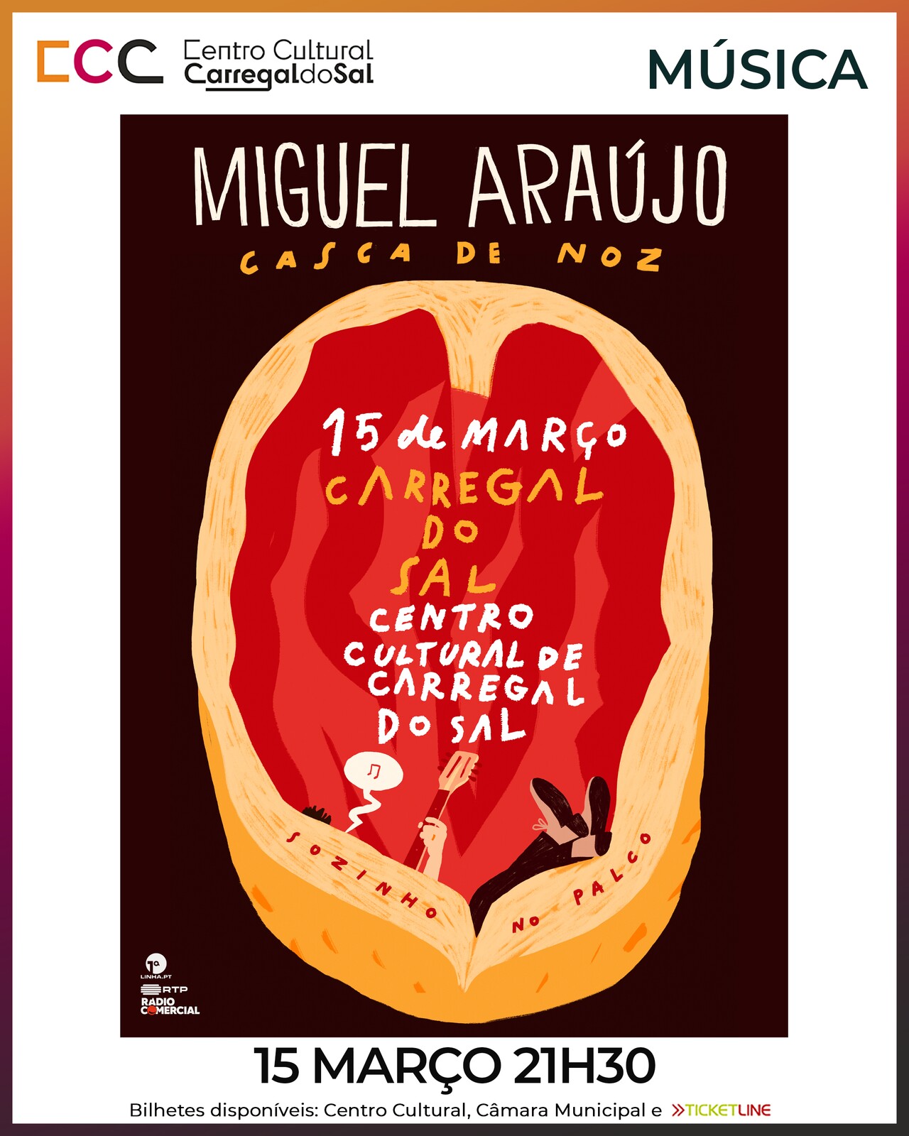 O Centro Cultural de Carregal do Sal orgulha-se de receber no seu auditório a 15 de março, Casca de Noz de e com Miguel Araújo. Seguimos firmes no nosso inadiável Encontro marcado com a Cultura.