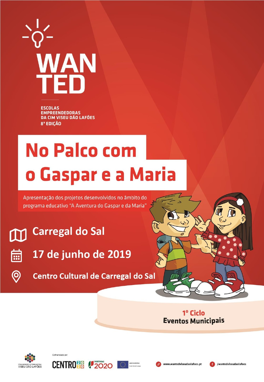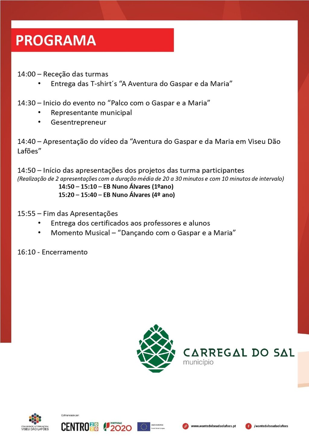 O auditório do Centro Cultural de Carregal do Sal acolhe, no dia 17 de junho, a partir das 14horas, as mascotes Gaspar e Maria e as turmas do 1.º Ciclo do Agrupamento de Escolas concelhio para o evento final do programa “A Aventura do Gaspar e da Maria”, do projeto Escolas Empreendedoras da CIM Viseu Dão Lafões.