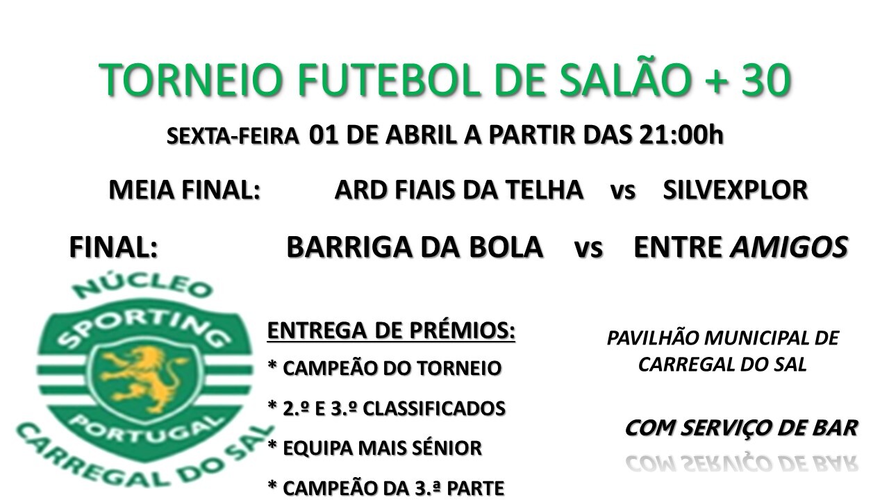 O Núcleo do Sporting Clube de Portugal de Carregal do Sal vai realizar pelas 21:00h da próxima sexta-feira, dia 01 de Abril, no Pavilhão Municipal, os jogos da meia final e final do Torneio de Futebol de Salão + 30 e correspondente entrega de prémios.