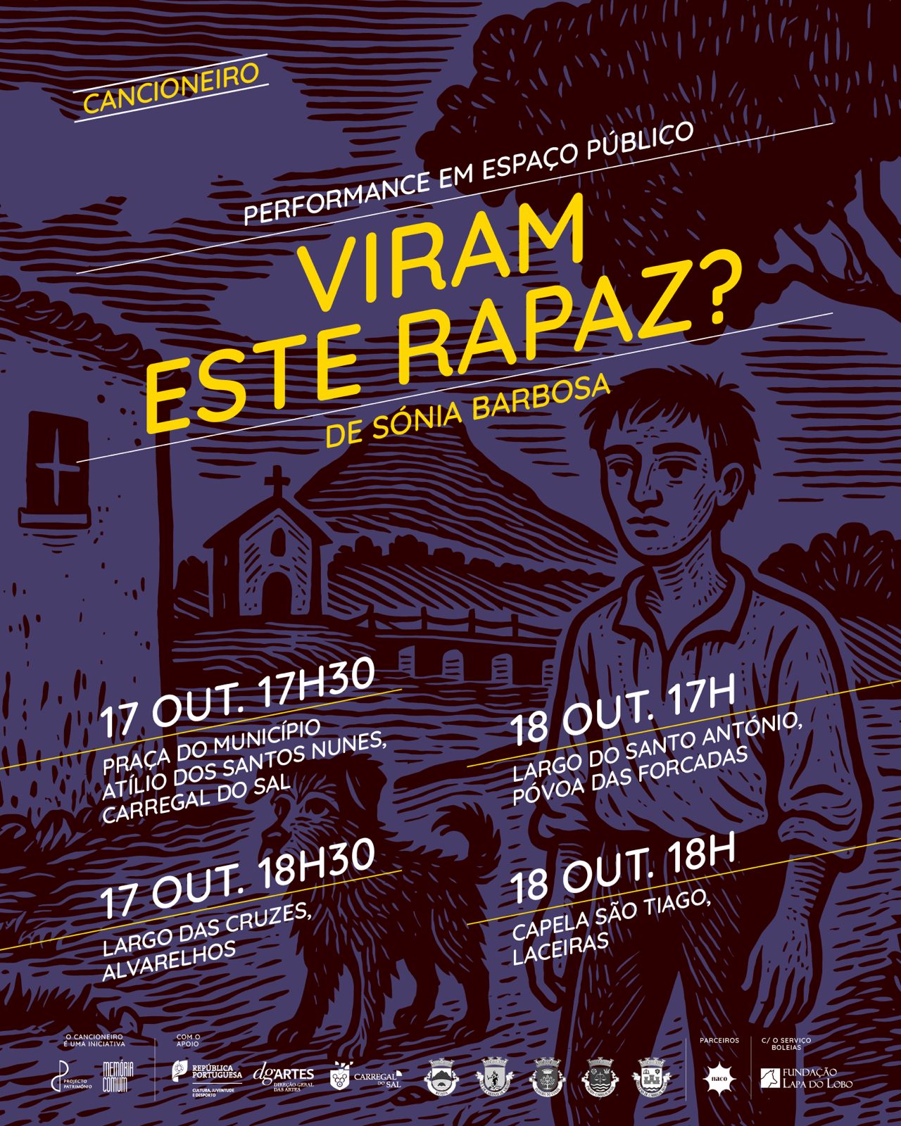Nos dias 17 e 18 de Outubro, uma mulher percorre Carregal do Sal, Alvarelhos, Póvoa das Forcadas e Laceiras à procura do filho desaparecido. Mostra um retrato desbotado, fala com quem passa, pede atenção — não apenas para o rapaz que perdeu, mas para todos os que o tempo apagou. “Viram este rapaz?” é uma performance de Sónia Barbosa sobre a perda, a resistência e a urgência de continuar a procurar humanidade. Acesso gratuito.