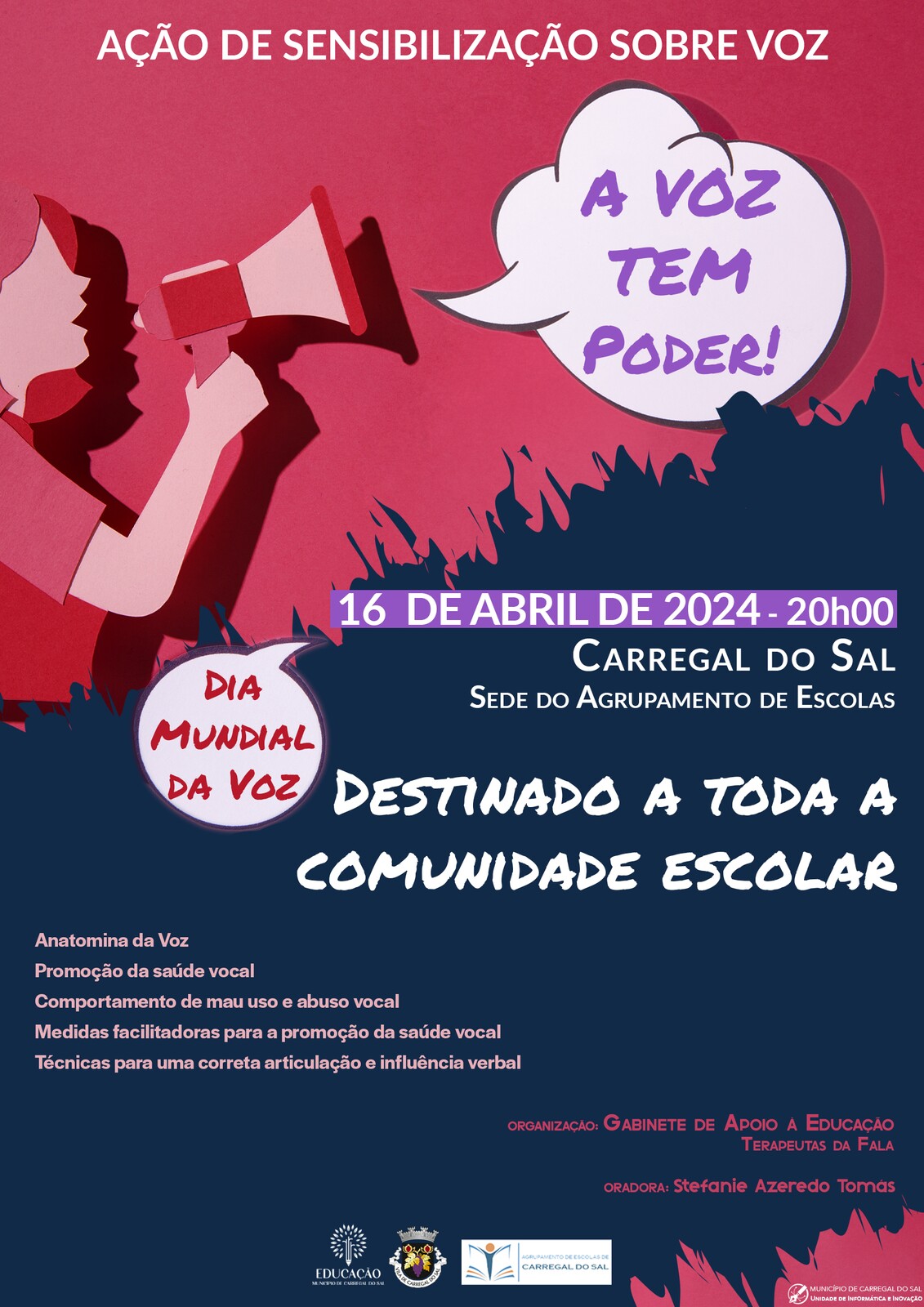 Como forma de assinalar o “Dia Mundial da Voz”, no dia 16 de abril, pelas 20 horas, as Terapeutas da Fala do Gabinete de Apoio à Educação organizarão a Ação de Sensibilização em questão, destacando a importância da saúde e do bem-estar da voz no dia-a-dia.