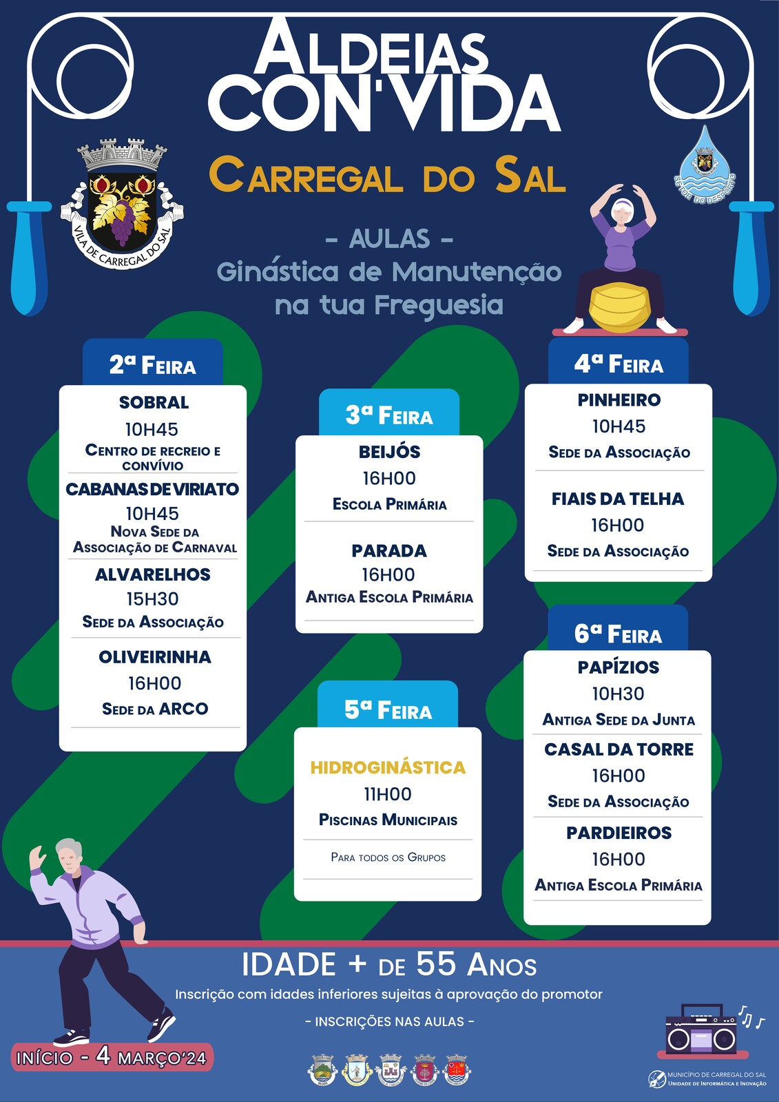 Ao dispor da população integrada nesta faixa etária, Aldeias Con’vida vai estar presente em vários locais do nosso território, através de aulas de atividade física ministradas pelos técnicos do Setor do Desporto, na busca de ir ao encontro desta população promovendo simultaneamente a proximidade e socialização.