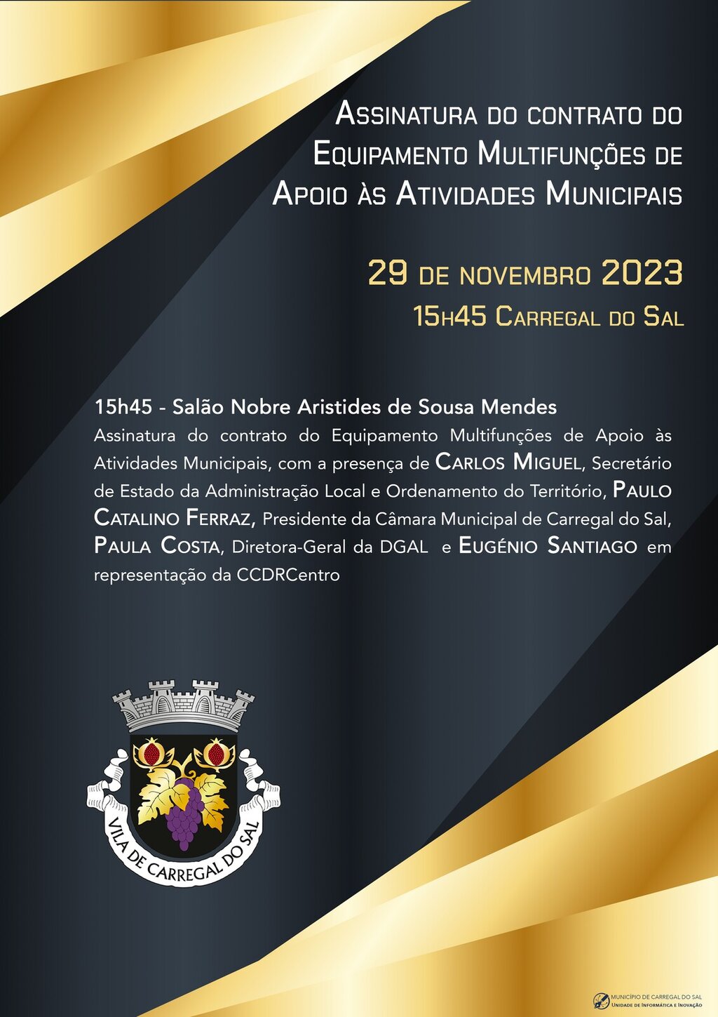 O Presidente da Câmara Municipal de Carregal do Sal, Paulo Catalino Ferraz, tem a honra de convidar V.ª Ex.ª a participar nas cerimónias oficiais da Assinatura do contrato do Equipamento Multifunções de Apoio às Atividades Municipais, no dia 29 de novembro de 2023 a decorrerem a partir das 15h45, com a presença de Carlos Miguel, Secretário de Estado da Administração Local e Ordenamento do Território, Paula Costa, Diretora-Geral da DGAL e Eugénio Santiago em representação da CCDRCentro.