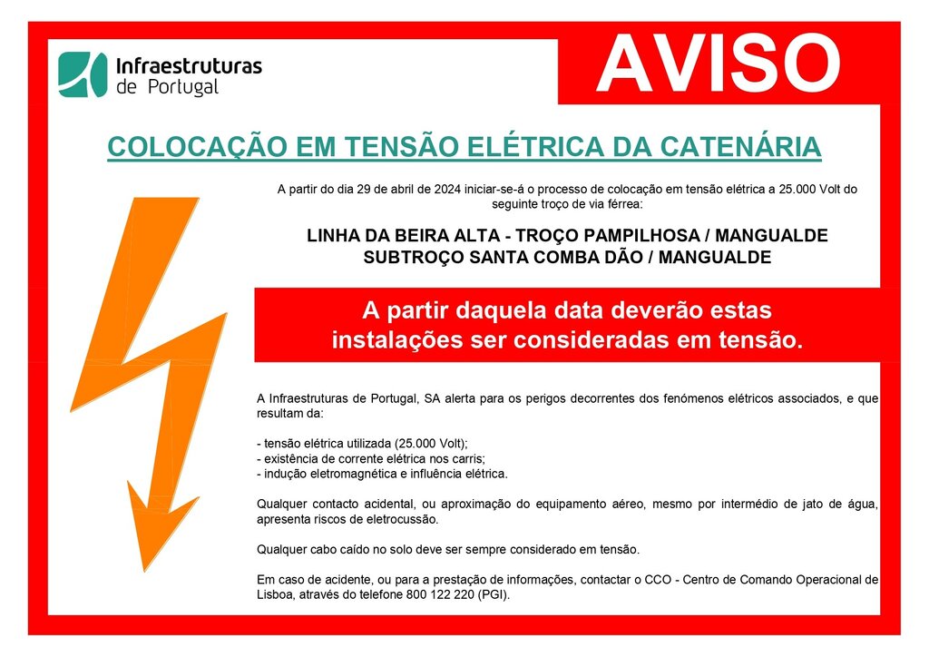 Informa-se que a partir de 29 de abril de 2024, iniciar-se-á o processo de colocação em tensão elétrica da catenária, a 25.000 V, entre a Estação de Santa Comba Dão (PK 84+850) e a Estação de Mangualde (PK 129+790), para realização de ensaios.