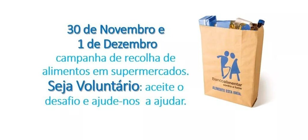 De 30 de novembro a 1 de dezembro, voluntários do Banco Alimentar vão espalhar-se pelos supermercados do Concelho, predispostos a recolherem os bens alimentares que queira e possa dar para ajudar quem precisa.
