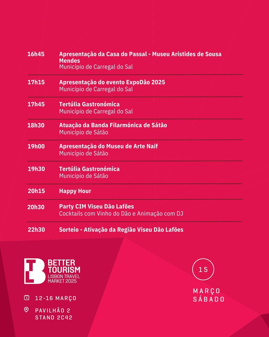 E, no stand da CIM Viseu Dão Lafões, os respetivos municípios mostram-se aos visitantes em dias distintos. Carregal do Sal apresenta-se a 15 de março (sábado) em três momentos diferentes: apresentação da Casa do Passal –Museu Aristides de Sousa Mendes; apresentação da ExpoDão 2025 e Tertúlia Gastronómica.