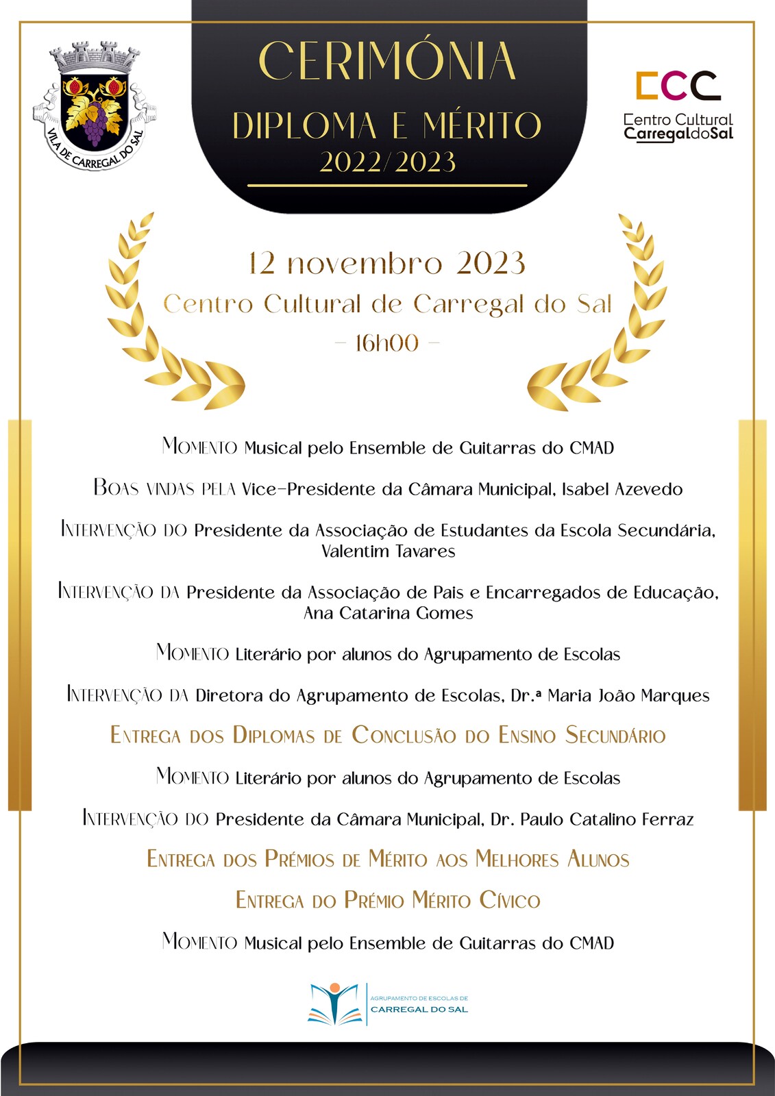 Momentos musicais e literários, garantidos por alunos do CMAD e do Agrupamento de Escolas de Carregal do Sal irão fazer parte, enriquecendo o programa da cerimónia.