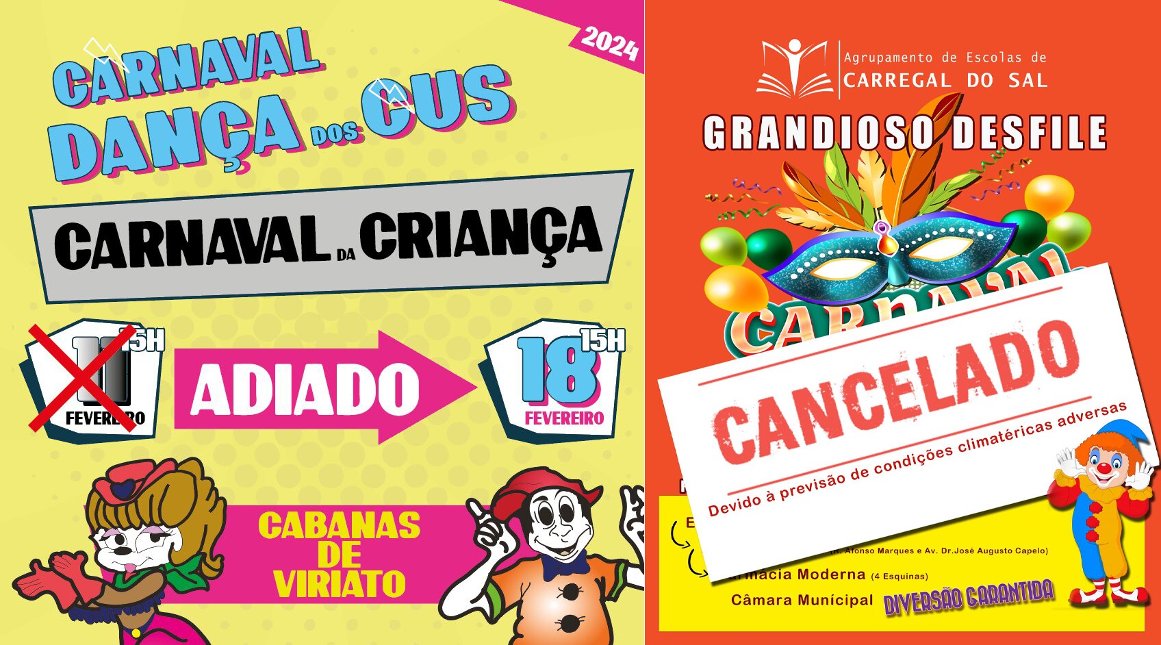 Face às condições meteorológicas adversas previstas para os próximos dias, o Agrupamento de Escolas de Carregal do Sal cancelou o tradicional Desfile de Carnaval, previamente agendado para o dia de amanhã, 9 de fevereiro.