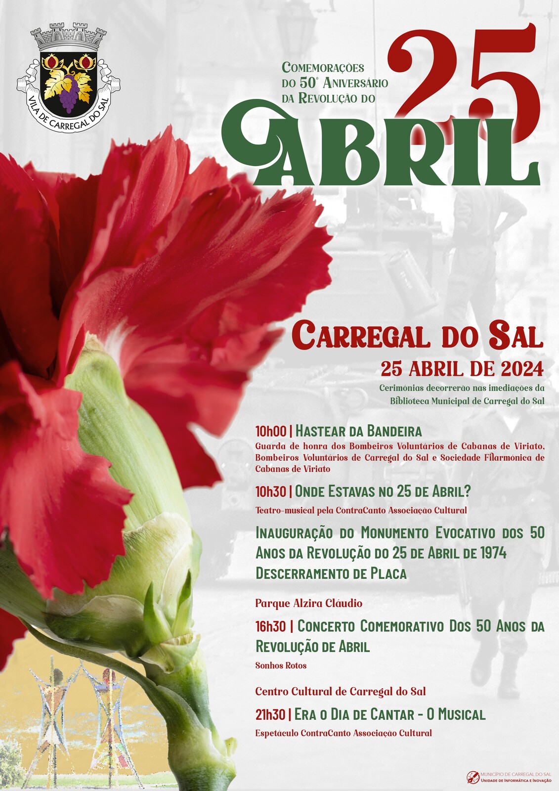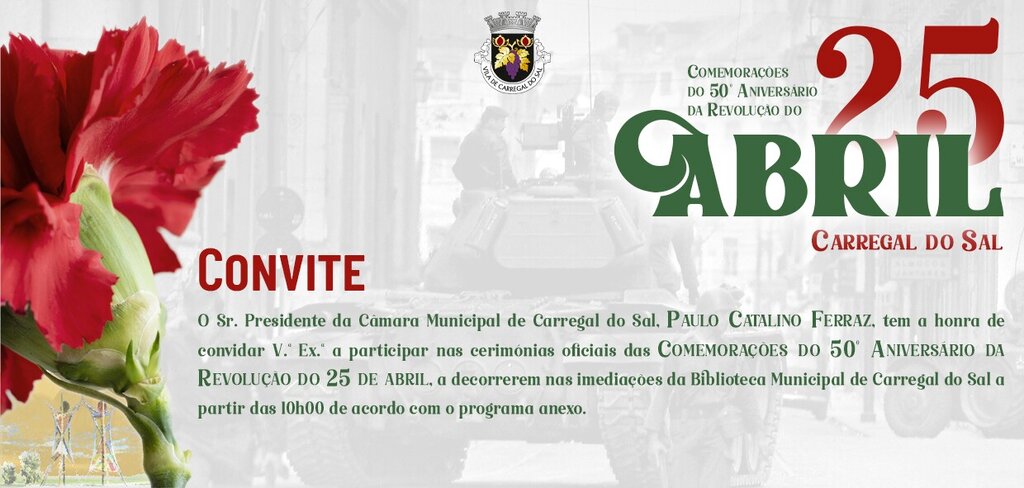 O Sr. Presidente da Câmara Municipal de Carregal do Sal, Paulo Catalino Ferraz, tem a honra de convidar V.ª Ex.ª a participar nas cerimónias oficiais das Comemorações do 50º Aniversário da Revolução do 25 de abril, a decorrerem nas imediações da Biblioteca Municipal de Carregal do Sal a partir das 10h00 de acordo com o programa anexo