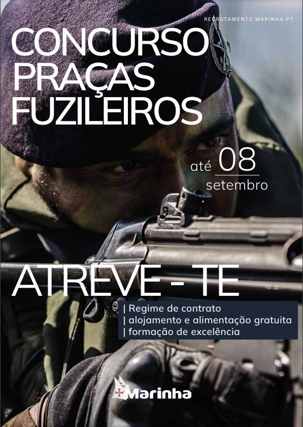 Até 8 de setembro estão abertos dois concursos de Praças da Marinha Portuguesa - Fuzileiros e Serviço Naval. Trata-se de dois concursos acessíveis a maiores de 18 anos e até 24 anos, no mínimo com o 9º de escolaridade, situação militar regularizada e nacionalidade portuguesa.