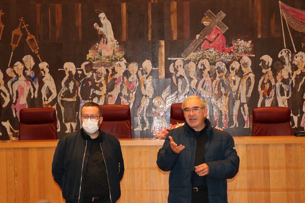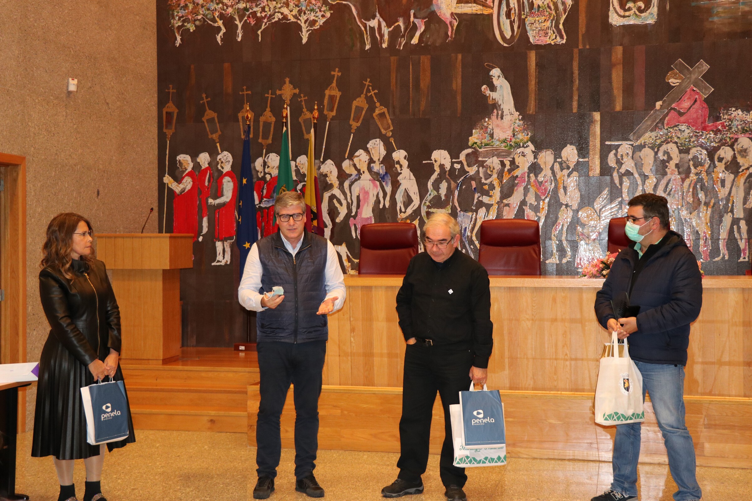 Após a realização de testes COVID 19, os elementos do Choral Polyphónico de Penela; do Grupo Coral Stella Maris, de Anadia e do Coro anfitrião – NACO CANTAT, foram recebidos no Salão Nobre do edifício dos Paços do Concelho pelo Vereador José Dias Batista e pelo Presidente da Direção da coletividade organizadora, José Manuel Figueiredo.