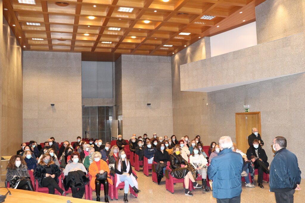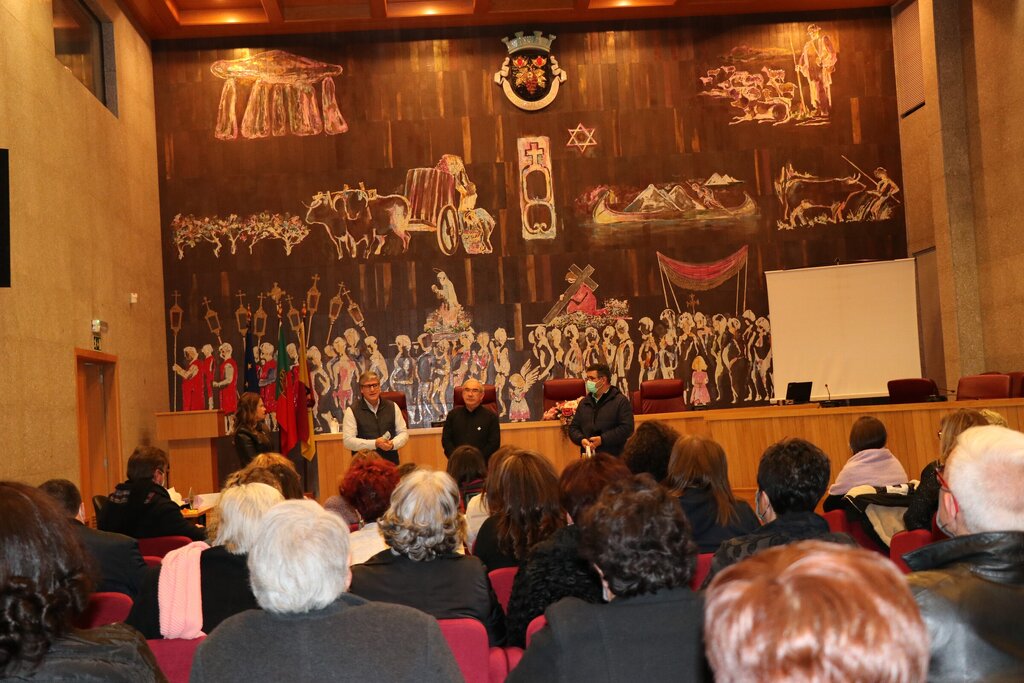 Os participantes, que se preparavam para o II ENCANTAT ficaram a conhecer um pouco sobre a origem, a história e as potencialidades do Concelho que os acolheu naquela noite fria, através da visualização de um vídeo promocional e da explicação do painel do Salão Nobre do edifício da Câmara Municipal. A tarefa coube ao Chefe de Administração Geral da Autarquia, António Ribeiro, que, em traços gerais, explicou cada pormenor ali representado através da arte de Fernando Crespo, autor do painel.