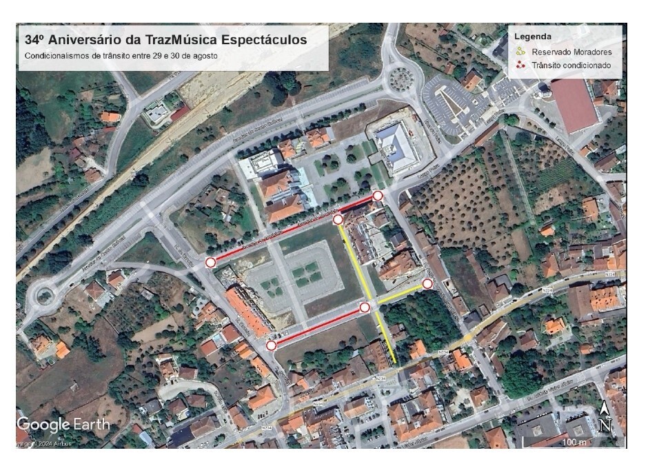 TORNA PÚBLICO, no âmbito da realização do “34º Aniversário TrazMúsica”, no dia 29 de agosto de 2024, o PLANO DE SINALIZAÇÃO TEMPORÁRIA, na Praça junto ao Edifício dos Paços do Concelho, de acordo com a planta anexa, que faz parte integrante deste Edital.