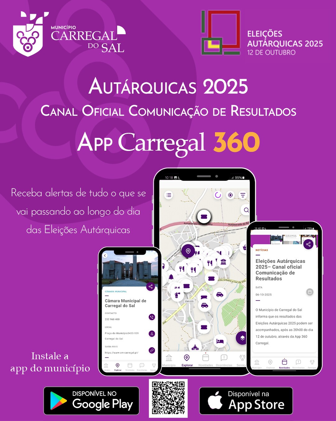 O Município de Carregal do Sal informa que os resultados das Eleições Autárquicas 2025 podem ser acompanhados, após as 20h00 do dia 12 de outubro, através da App 360 Carregal.