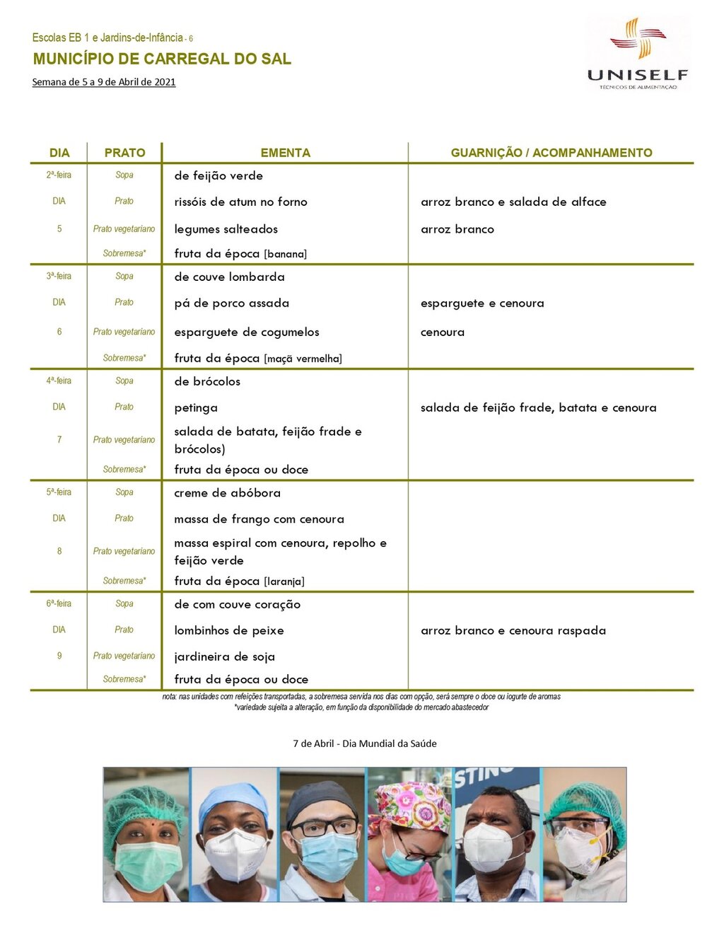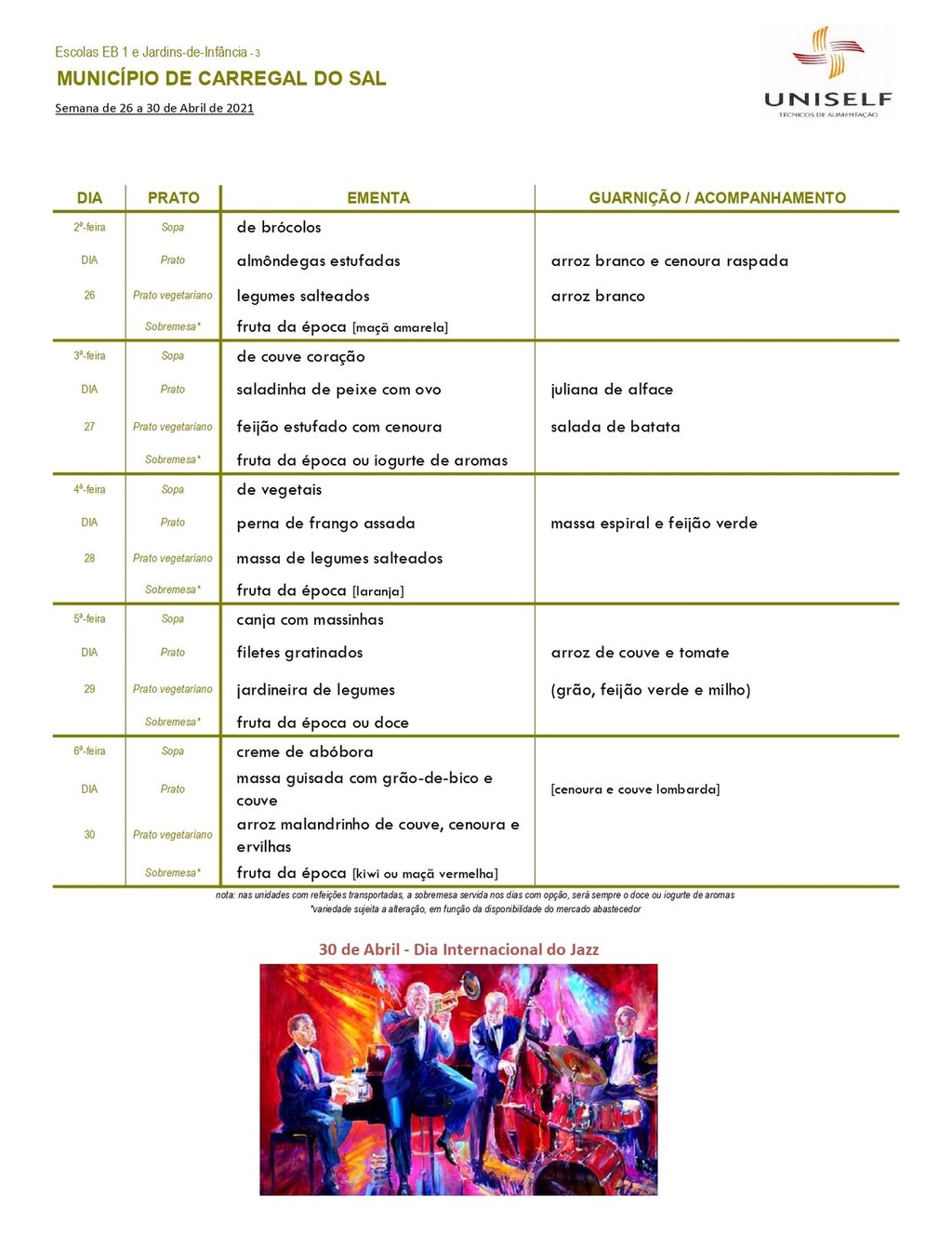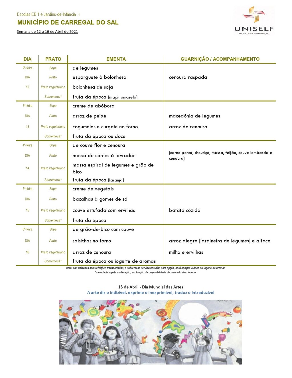 Ementa escolar para os alunos do pré-escolar e 1º CEB
