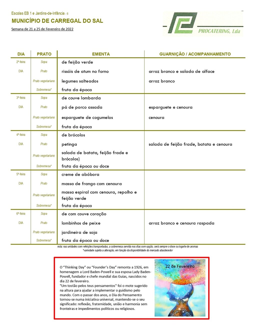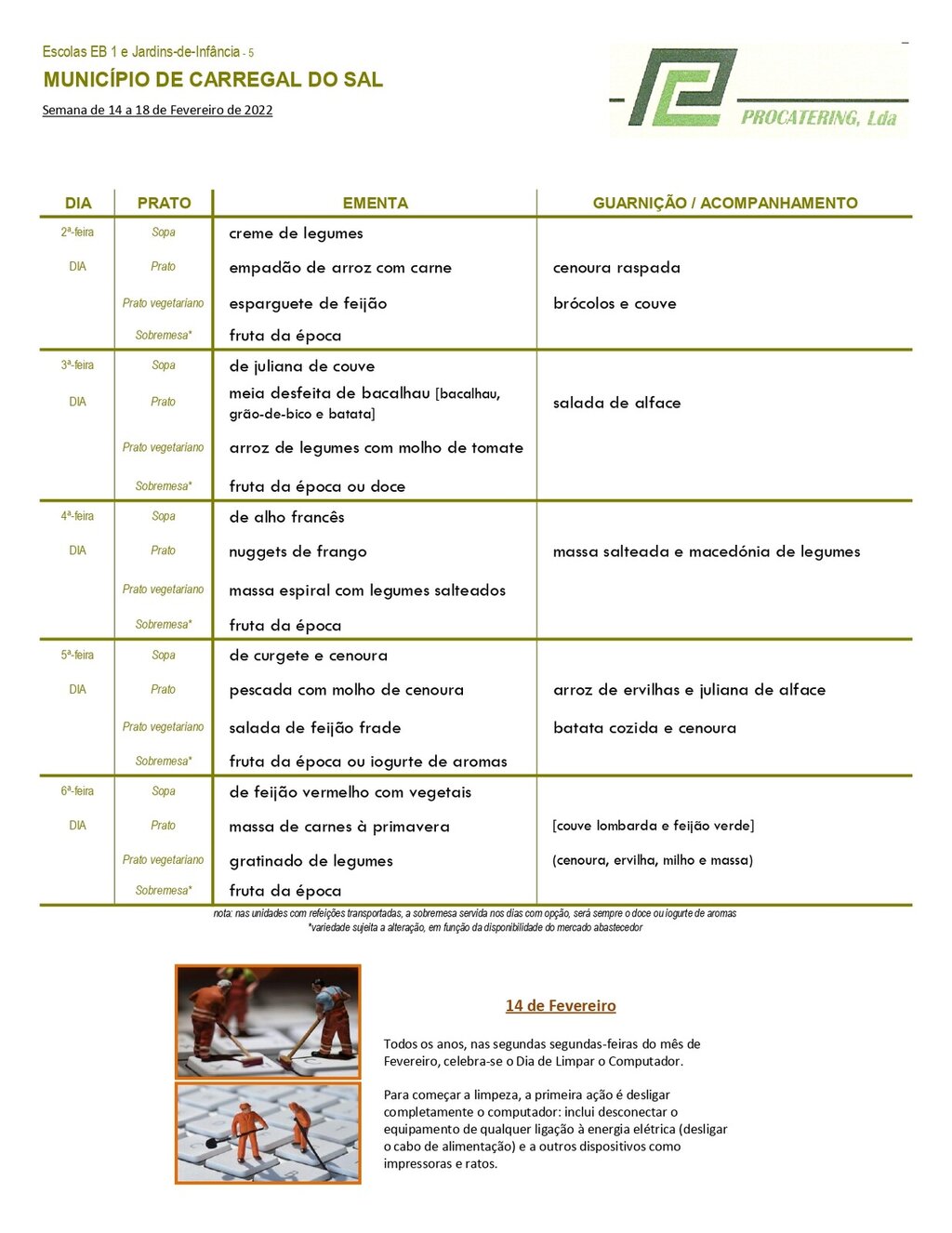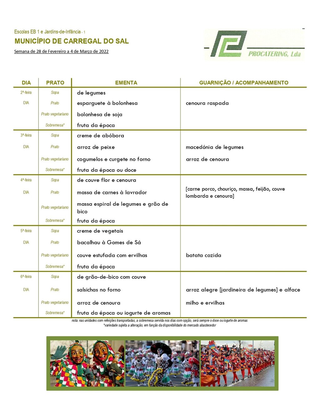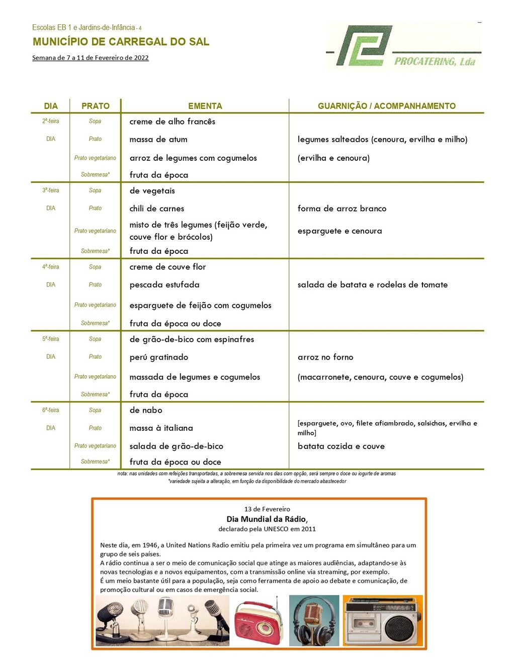 Ementa escolar para os alunos do pré-escolar e 1º CEB.