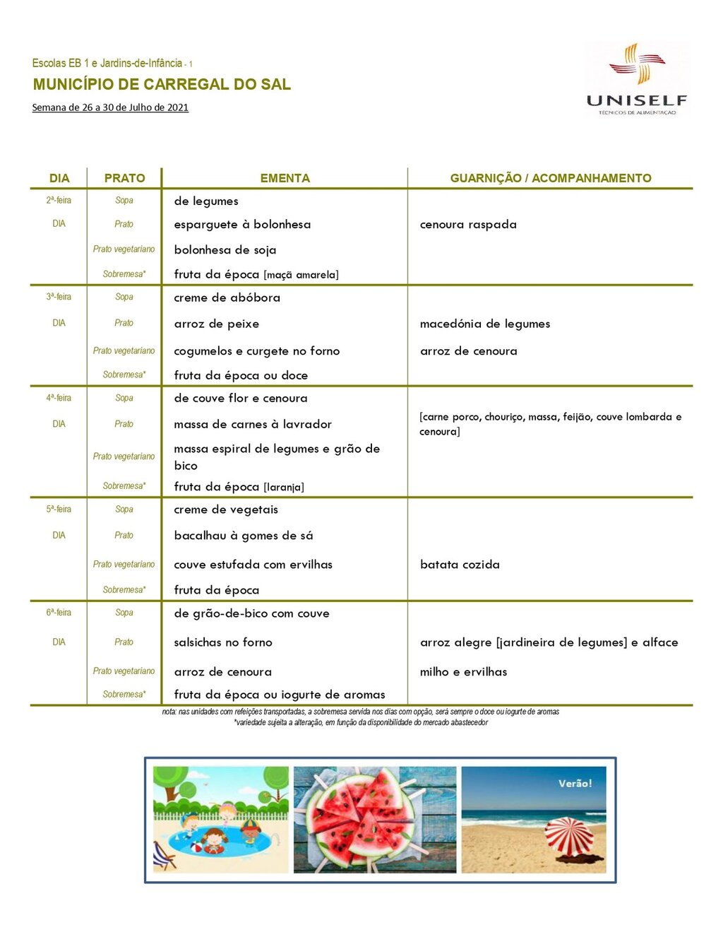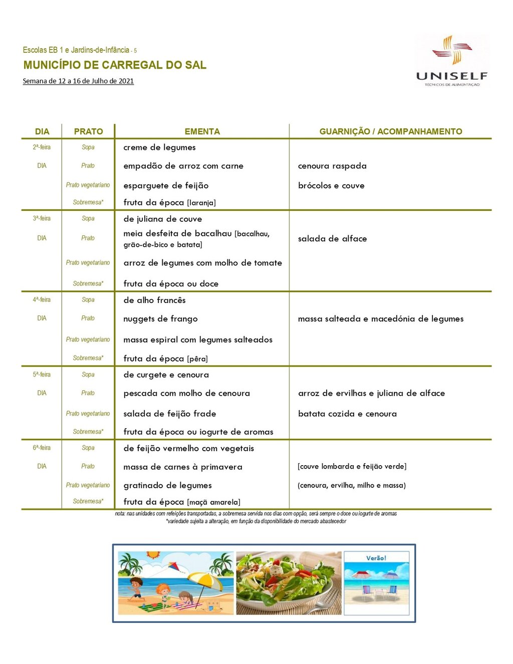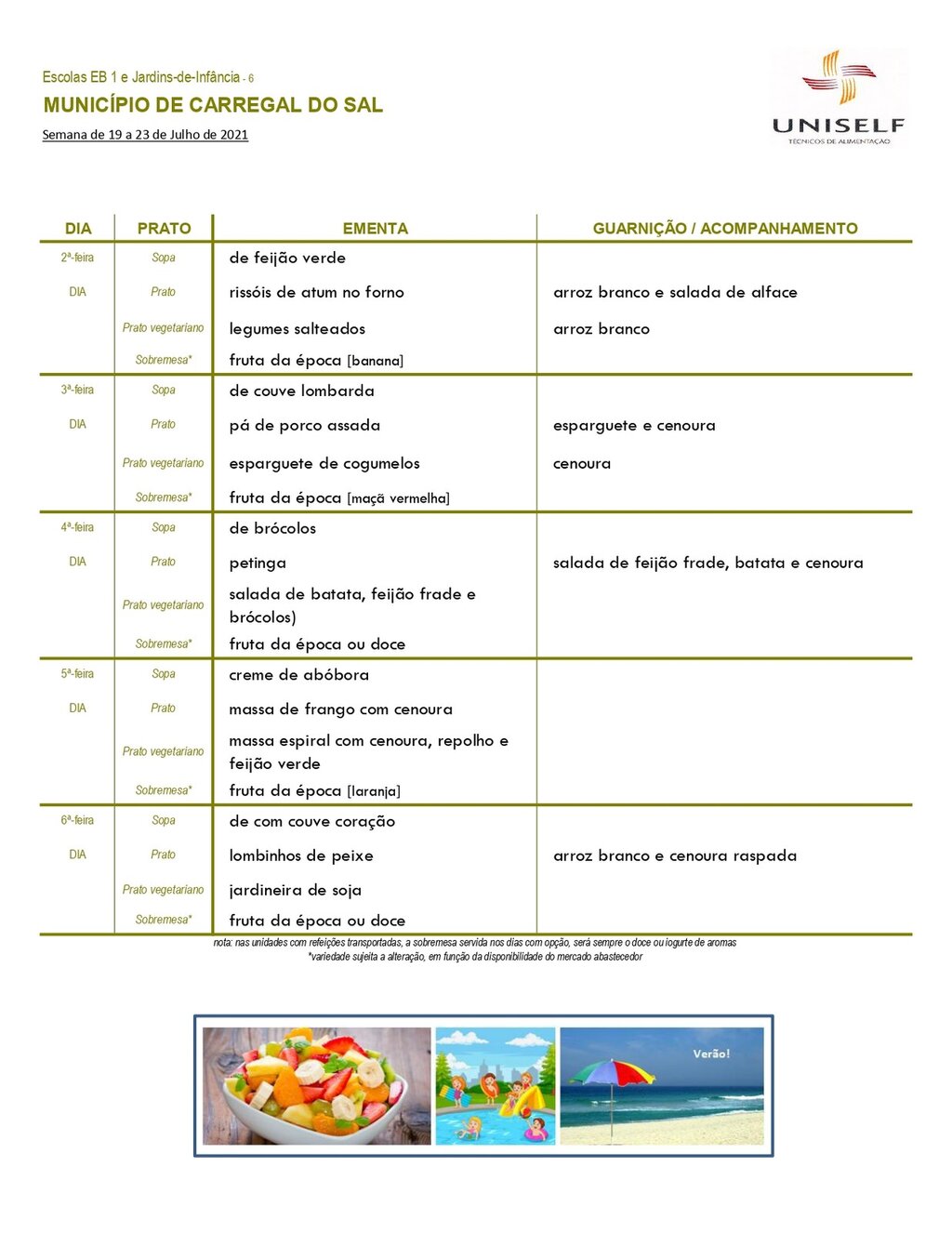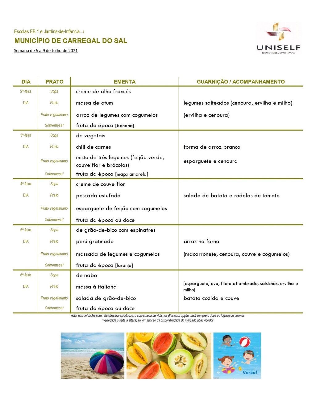 Ementa escolar para os alunos do pré-escolar e 1º CEB