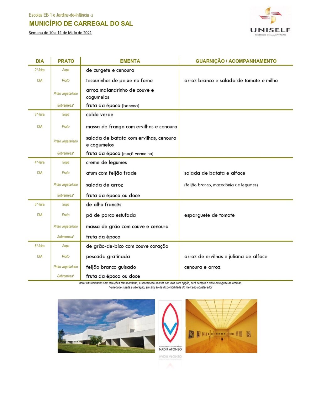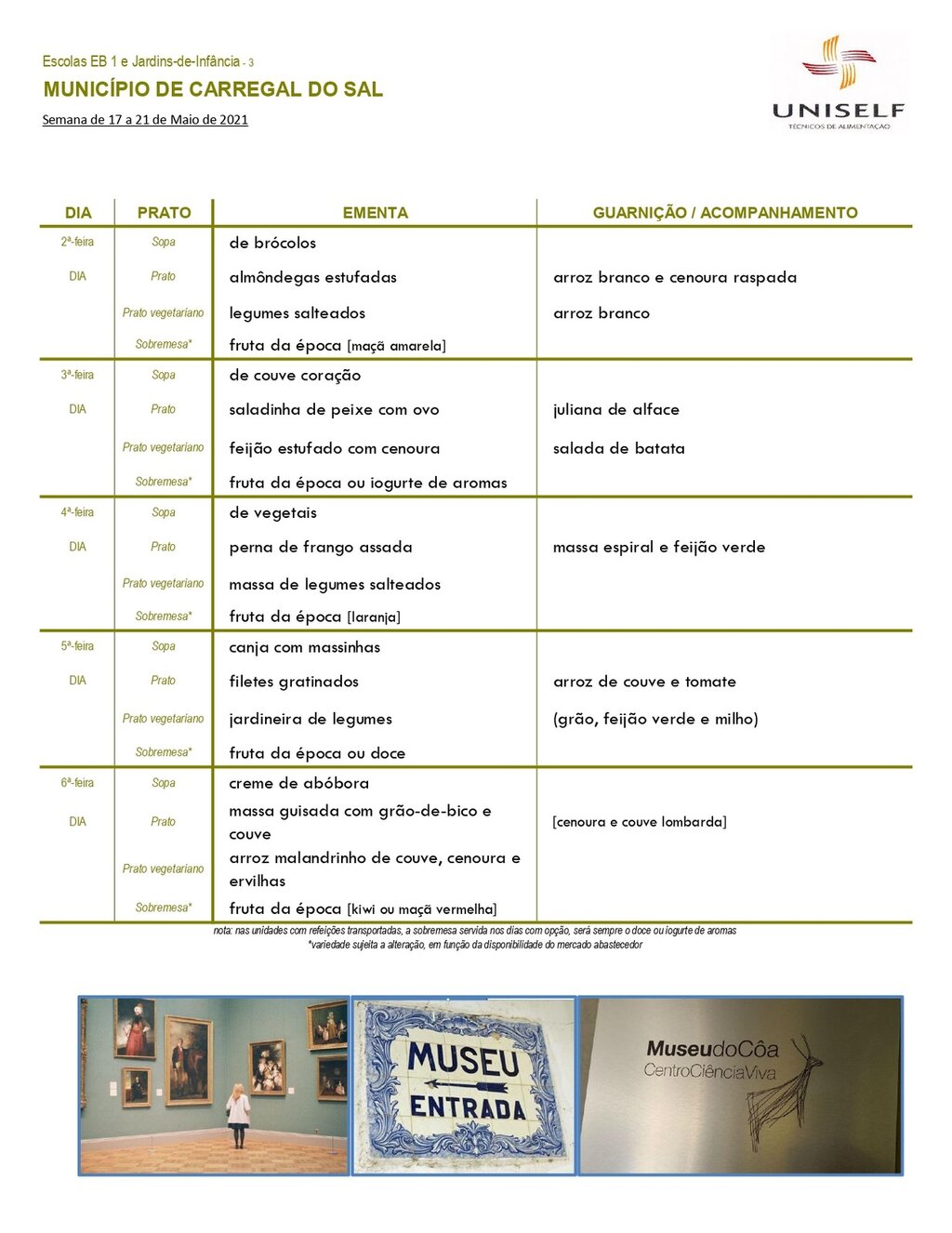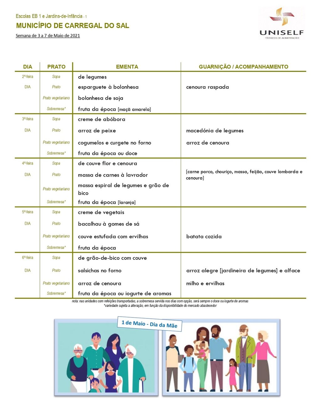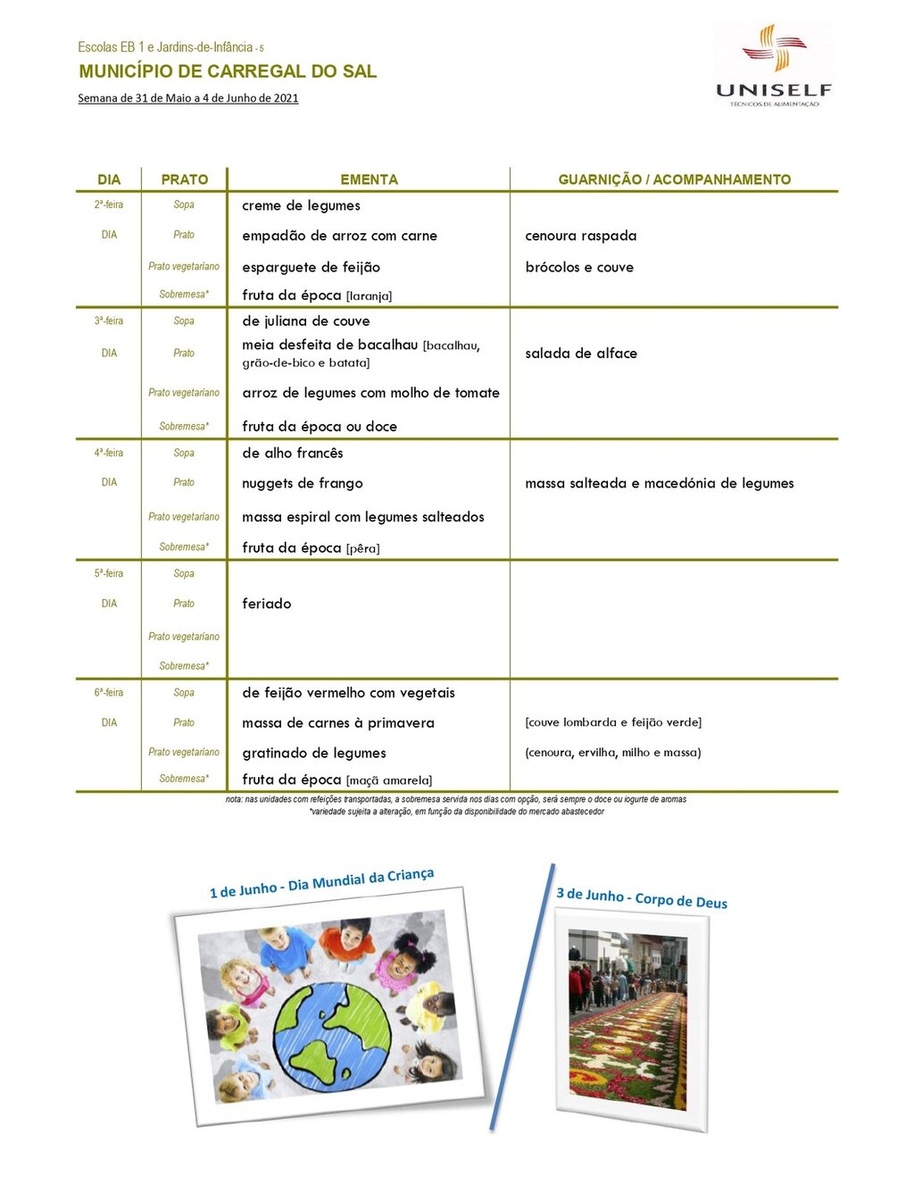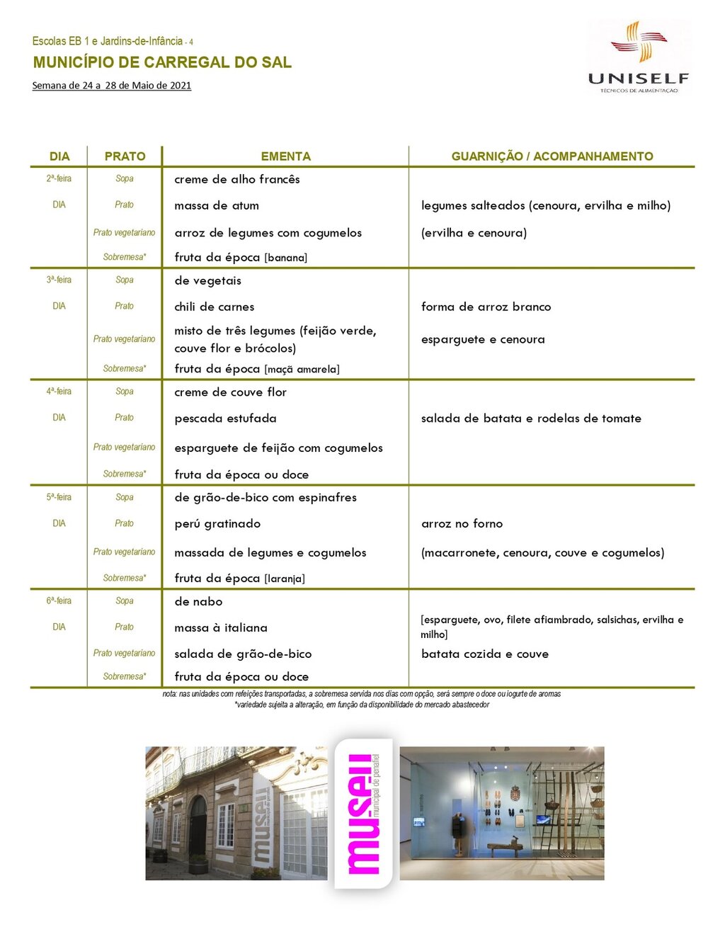 Ementa escolar para os alunos do pré-escolar e 1º CEB.