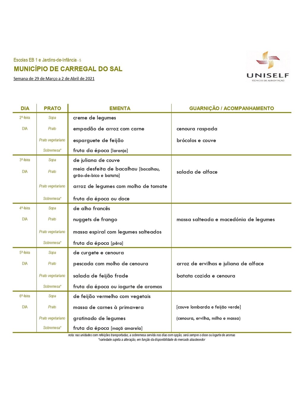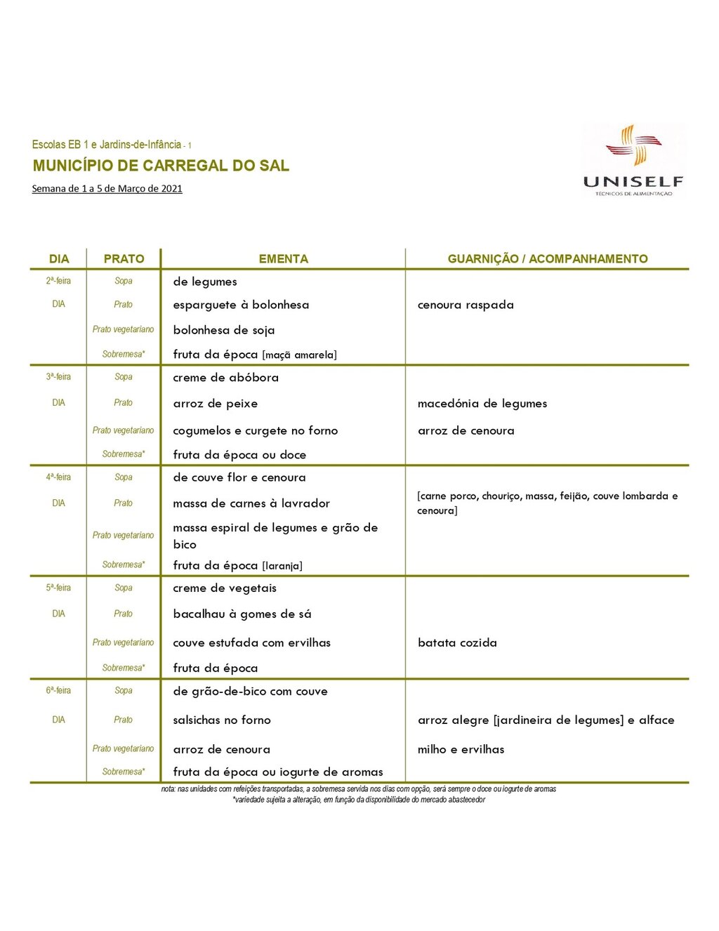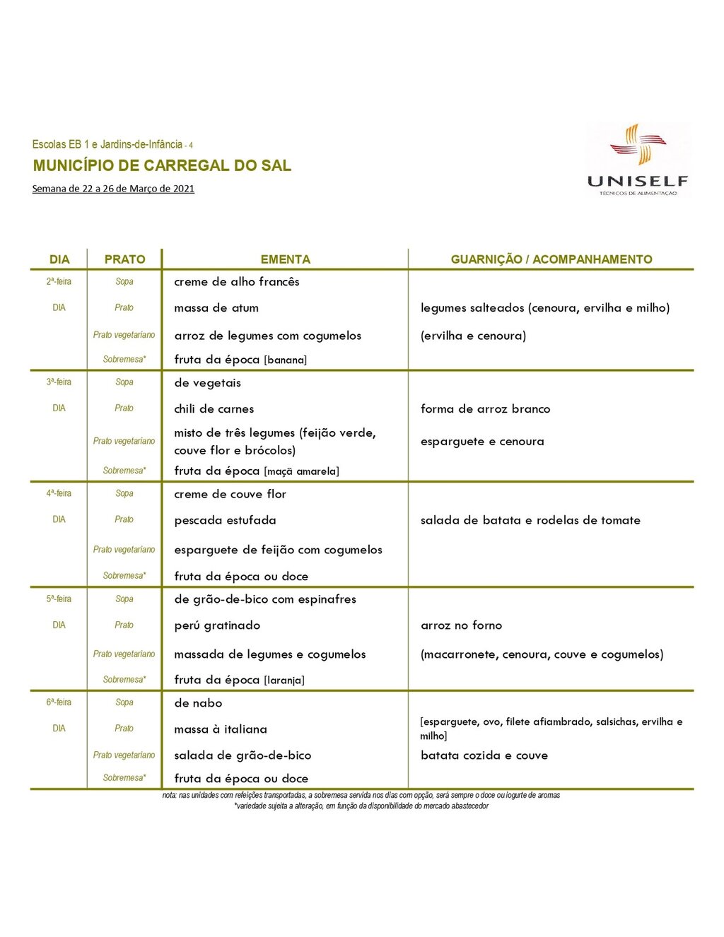 Ementa escolar para os alunos do pré-escolar e 1º CEB