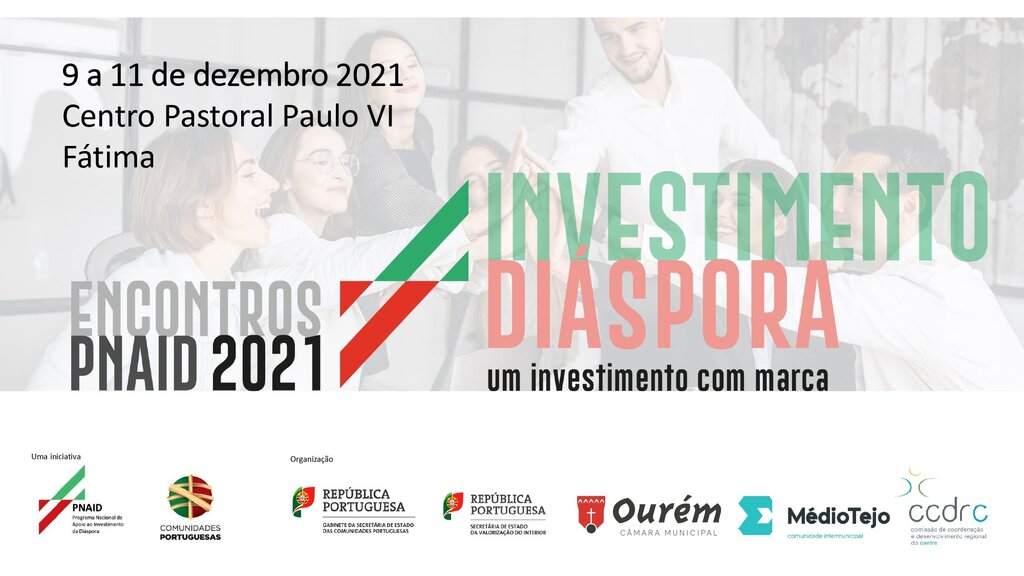 Os Encontros PNAID 2021 decorrerão em Fátima de 9 a 11 de dezembro. O evento, que dá continuidade aos Encontros de Investidores da Diáspora, promove a interação entre redes de portugueses e lusodescendentes no estrangeiro e a partilha de informação relativa a apoios e programas para as comunidades portuguesas.