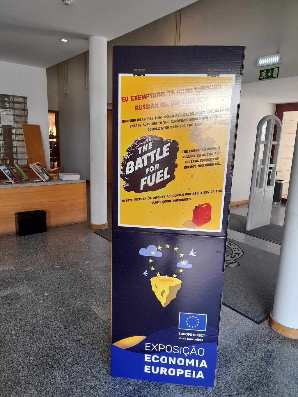 Integrada nas atividades dinamizadas pela RIBVDL - Rede Intermunicipal de Bibliotecas Viseu Dão Lafões e, inserida no projeto “Europe Direct Viseu Dão Lafões”, a exposição foi desenvolvida por alunos do 3º ano da licenciatura em Economia, da Universidade de Aveiro, com o propósito de auxílio no reforço, aprofundamento e conhecimento dos cidadãos, relativamente a temas importantes da atualidade, que estão na agenda da União Europeia, como sejam: a “Transformação digital”, a “Guerra na Ucrânia” ou ainda a “Dependência energética de EU face à Rússia”.