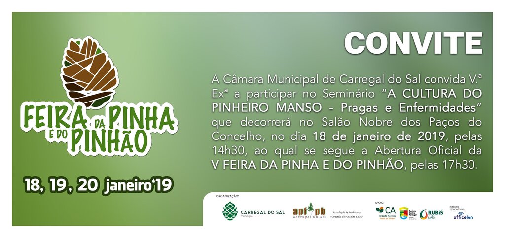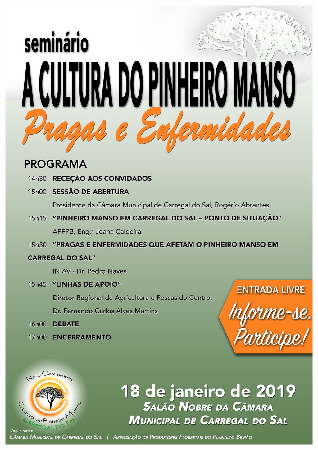 Mas já antes, a partir das 14h30, se fala de pinheiro manso. É no seminário “A Cultura do Pinheiro Manso: pragas e enfermidades”, que se realiza no Salão Nobre da Câmara Municipal de Carregal do Sal e que conta com a presença do Diretor Regional de Agricultura e Pescas do Centro, Fernando Martins.
