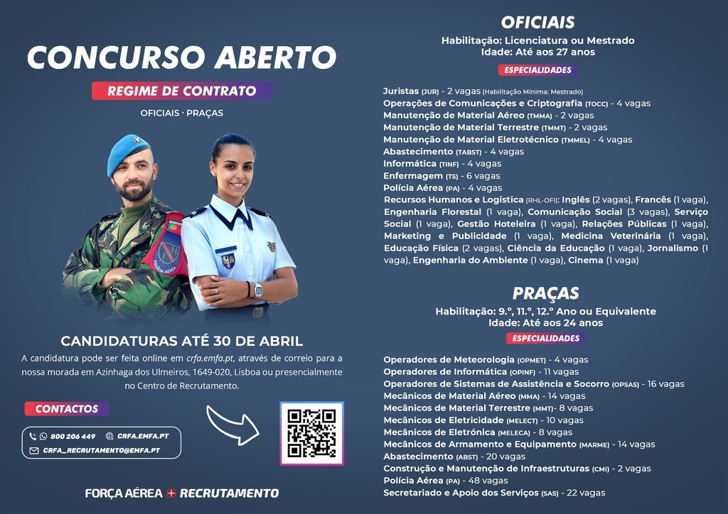 A Força Aérea tem abertos concursos de admissão ao Curso de Formação de Oficiais e ao Curso de Formação de Praças, do Regime de Contrato, para efetuar uma incorporação em junho do corrente ano.