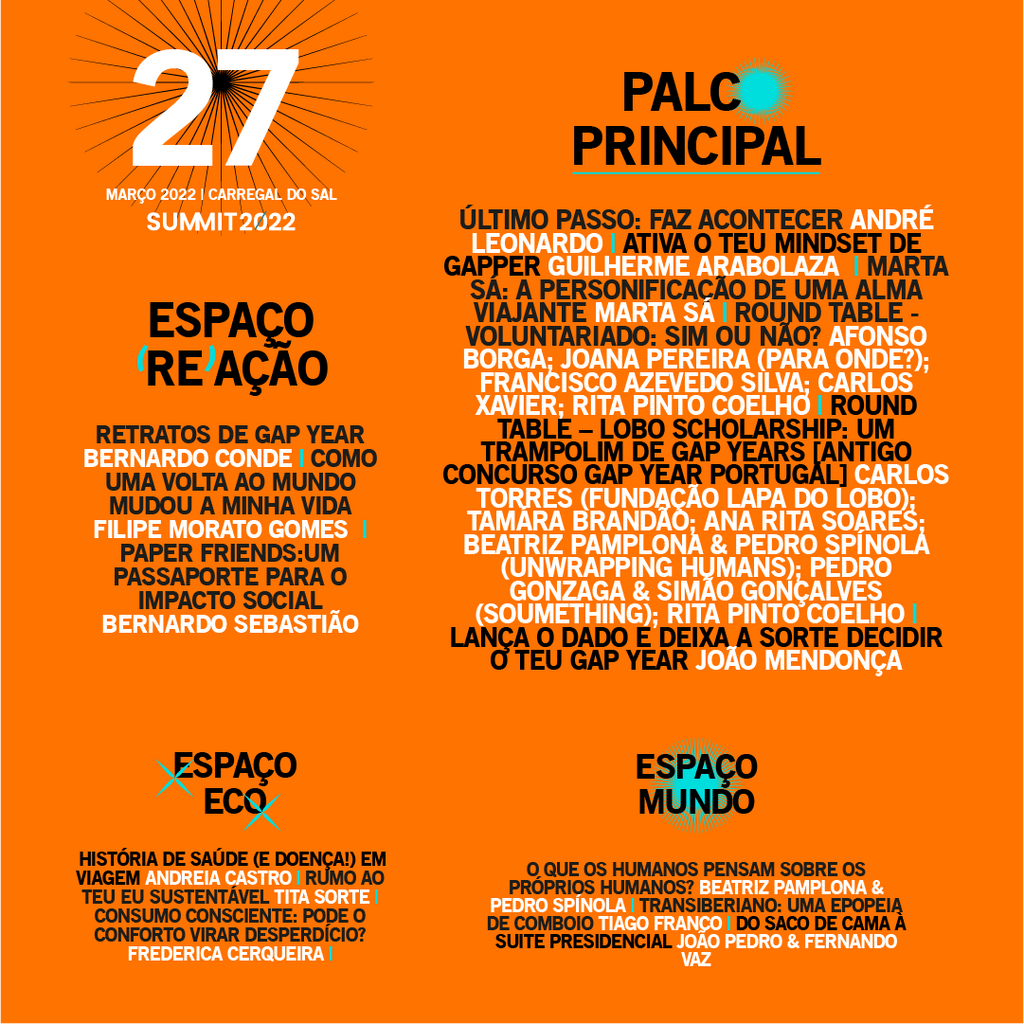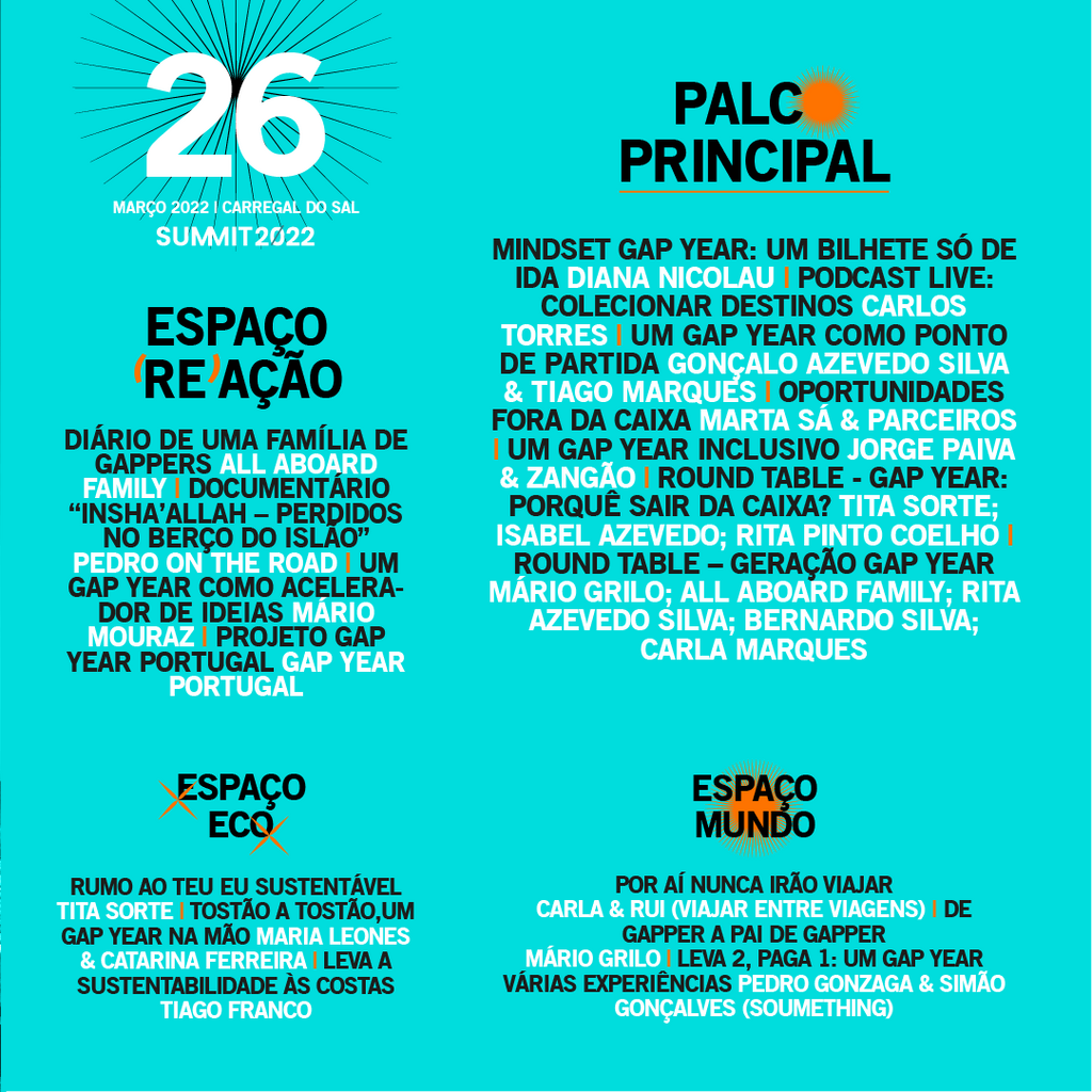 De 25 a 27 de março a vila de Carregal do Sal será o palco de uma viagem imersiva e itinerante, experienciada através de workshops, palestras, testemunhos em primeira mão e live-acts distribuídos por vários locais da vila. Destinado a todos os que vivem e querem viver neste mindset gap year, o evento vai trazer variadas temáticas, desde viagens, voluntariado, projetos sociais, sustentabilidade e inclusão. O objetivo é só um: mostrar aos/às participantes do Gap Year Summit 2022 possíveis alternativas ao chamado percurso convencional e apelar a um modo de vida “mais” – mais informado e mais consciente – e sem amarras.