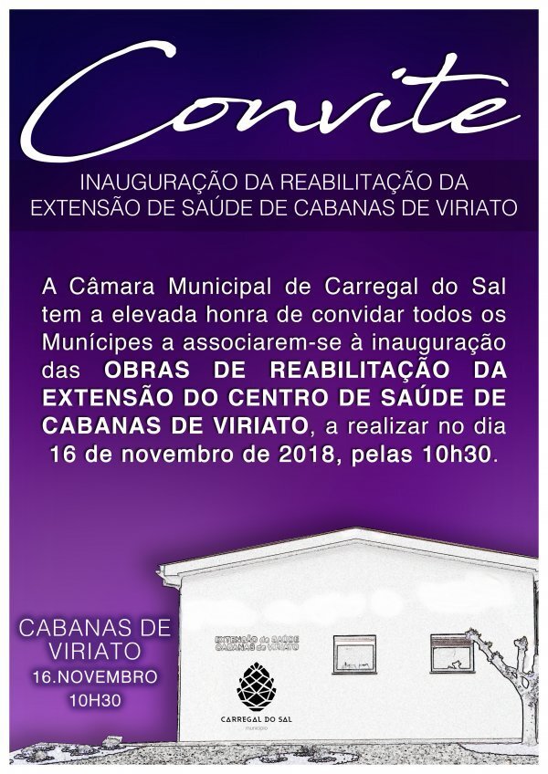 A Câmara Municipal de Carregal do Sal vai inaugurar as obras de reabilitação realizadas na Extensão de Saúde de Cabanas de Viriato, no dia 16 de novembro, às 10h30.
