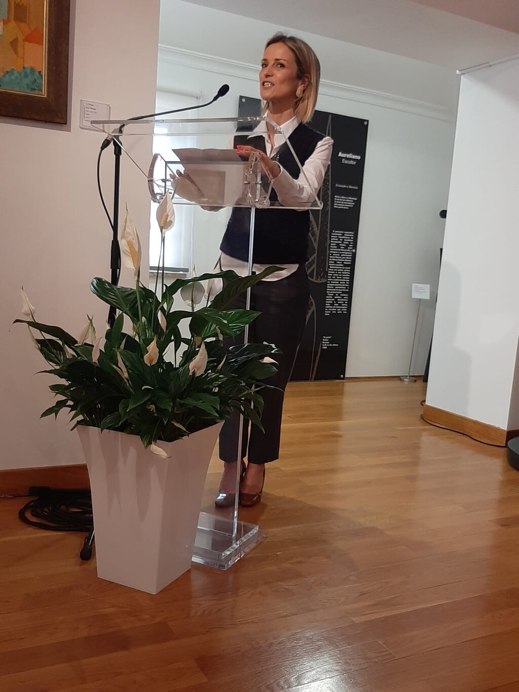 E, na abertura da sessão, foi primeiramente convidada a usar a palavra a representante da família e irmã da artista, Esmeralda Veloso. Visivelmente emocionada, agradeceu o reconhecimento da Câmara Municipal, a criação do espaço dedicado a DINA que disse vem “alargar o leque cultural que o Museu já oferecia” e, por isso, a família está muito orgulhosa e feliz. Terminou a sua intervenção com a leitura de um poema da autoria de Rosa Lobato Faria, que esta ofereceu a Dina num dos seus aniversários, e que também está exposto no Museu Municipal.