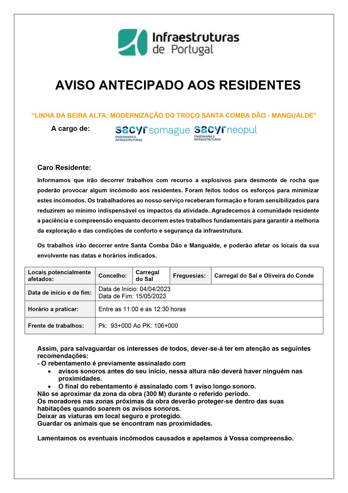 No seguimento dos trabalhos adjudicados cumpre informar do período previsto para a realização de atividades de desmonte de rocha por intermédio de explosivos, estando o mesmo compreendido entre 04/04/2023 e 15/05/2023 e que abrangerá as freguesias de: Carregal do Sal e Oliveira do Conde.