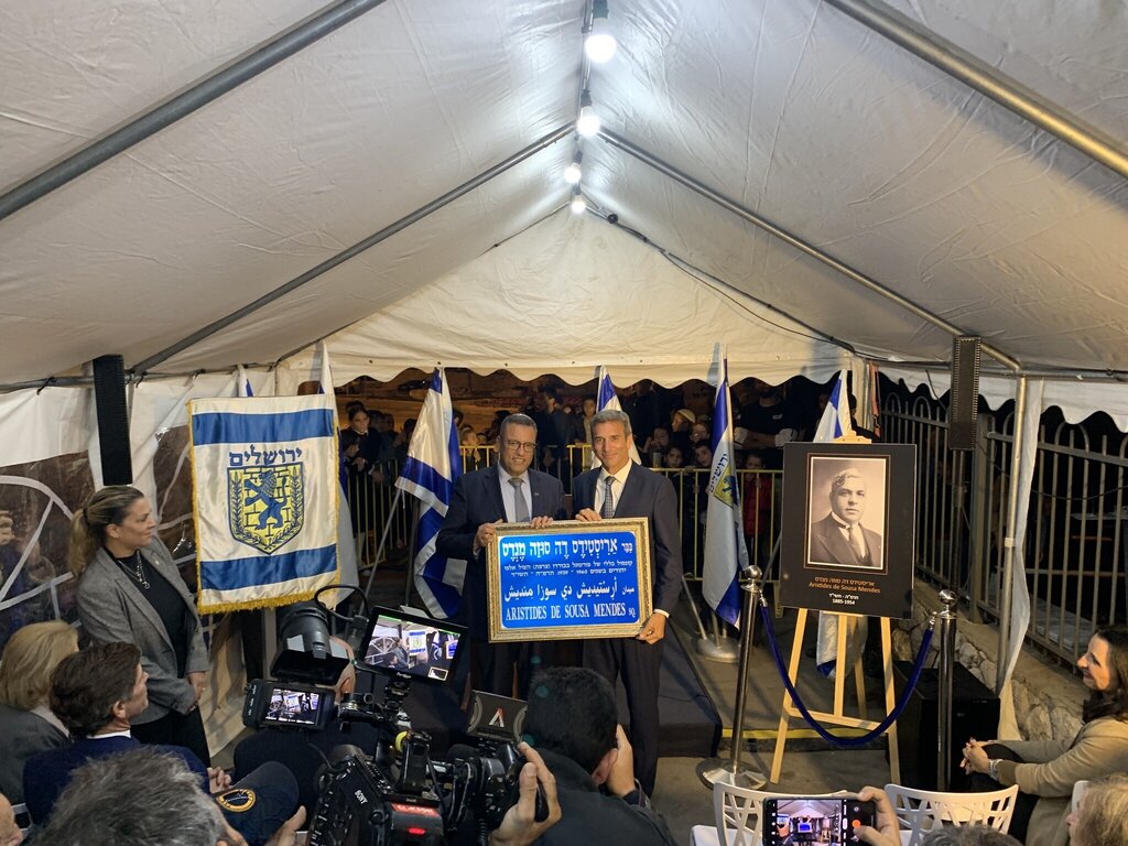 A Câmara Municipal de Jerusalém atribuiu ontem, dia 08 de novembro de 2002, o nome do diplomata português Aristides de Sousa Mendes a uma praça em homenagem ao gesto heroico de salvamento de milhares de judeus durante o Holocausto.
