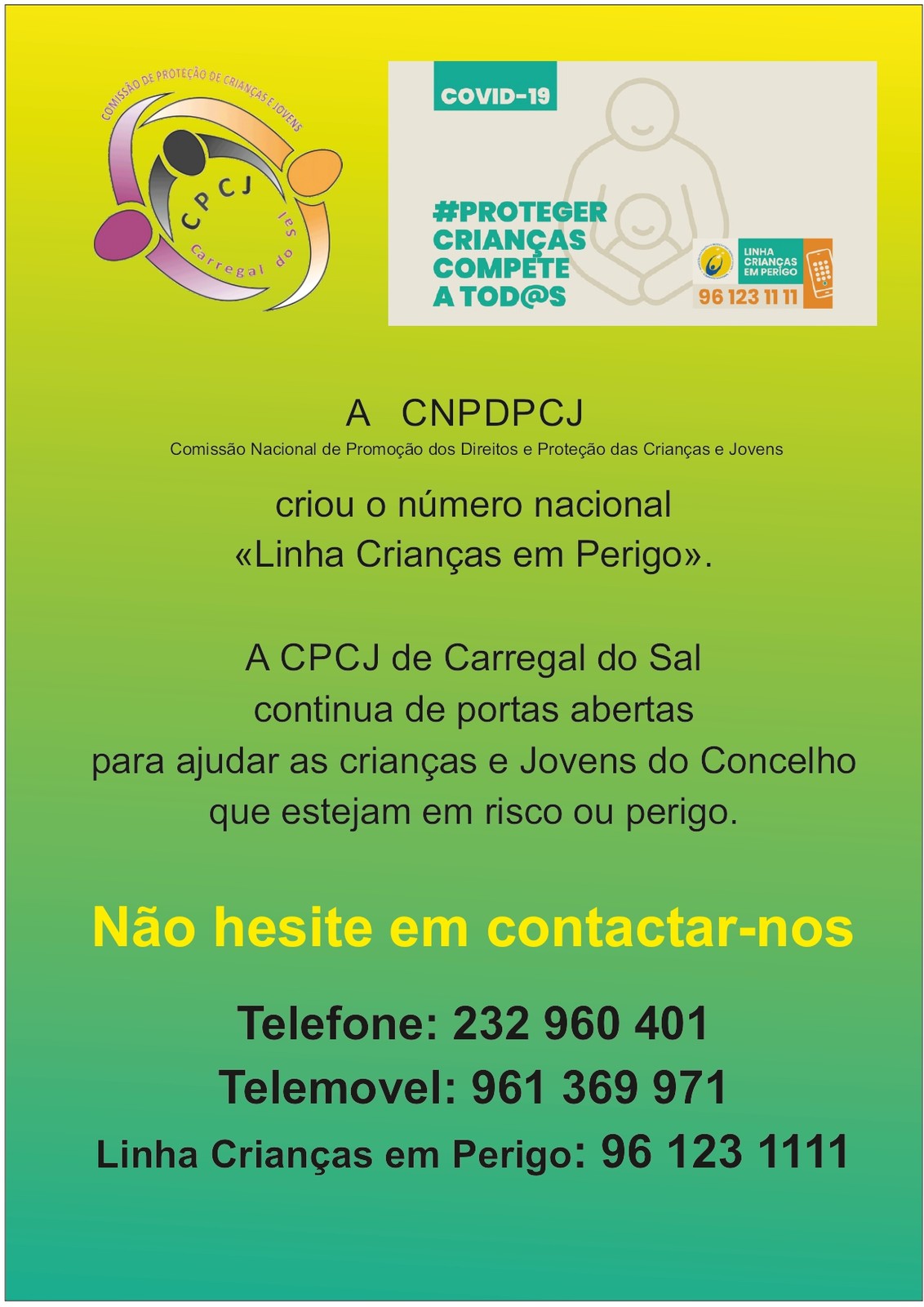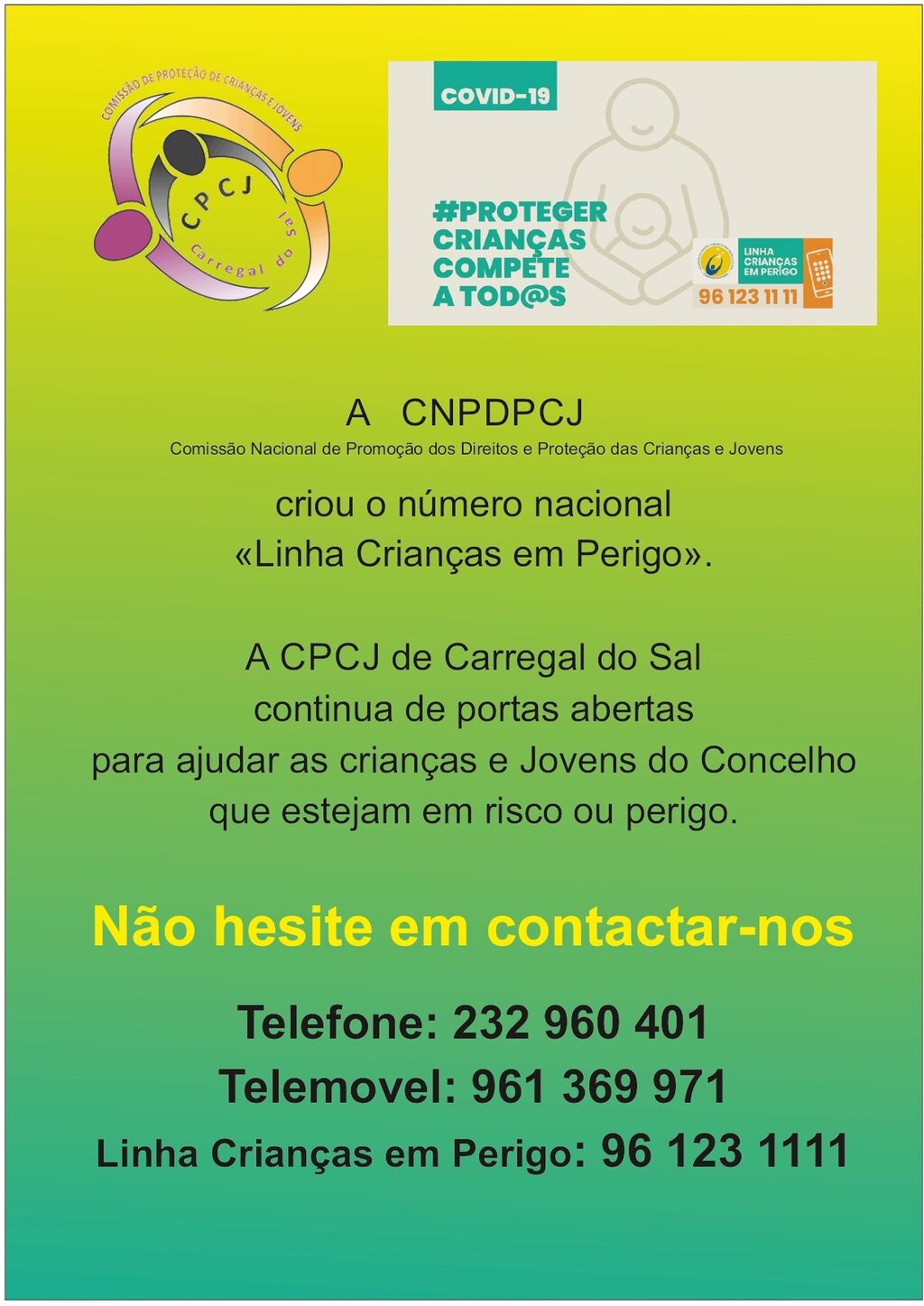 Carregal do Sal alia-se a esta divulgação/sensibilização e a CPCJ concelhia dispõe também de contactos próprios e diretos que deve ligar, perante o conhecimento ou suspeita de situações que careçam de intervenção. São eles: 232960401 e/ou 961369971.