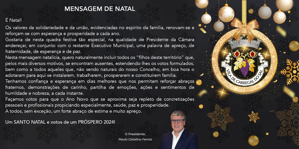 Nesta mensagem natalícia, quero naturalmente incluir todos os “filhos deste território” que, pelos mais diversos motivos, se encontram ausentes, estendendo-lhes os votos formulados, bem como a todos aqueles que, não sendo naturais do nosso Concelho, em boa hora o adotaram para aqui se instalarem, trabalharem, prosperarem e constituírem família.