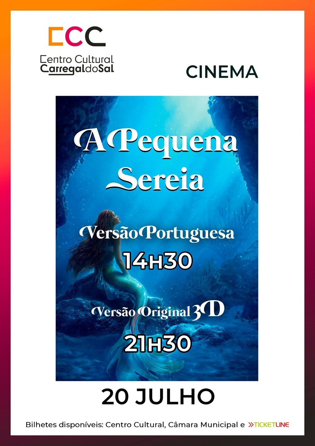 O primeiro filme a ser exibido é “A Pequena Sereia”. Inicialmente previsto para a versão 3D em português, porém, por problemas técnicos da distribuidora com a versão dobrada 3D em português, será exibida a versão 2D, dobrada em português, numa sessão extra a realizar na tarde de amanhã, 20 de julho, pelas 14:30 - aberta a todas as crianças/jovens do Concelho, com oferta de pipocas, limitada a lotação da sala. Os bilhetes estão disponíveis no Centro Cultural e na Câmara Municipal.