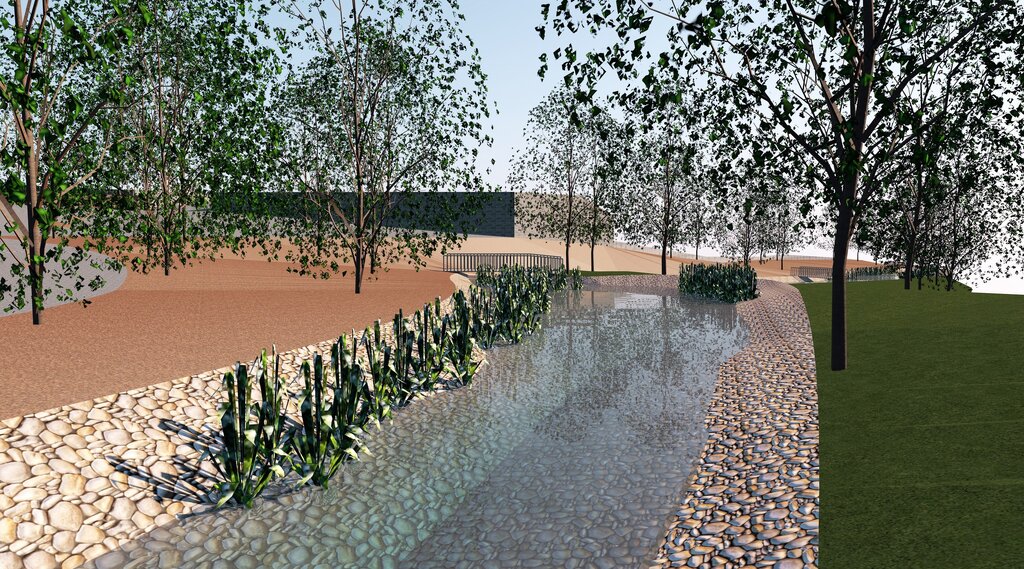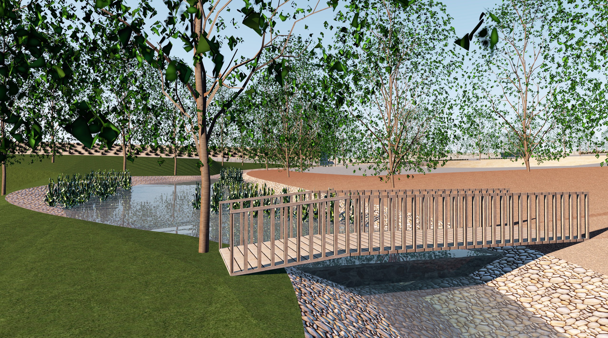 - Zona de lazer, com áreas verdes ajardinadas e arborizadas, será consolidada com o aproveitamento da linha de água que atravessa essa área e se pretende conduzir pelo meio da área de jardim e criar duas pequenas pontes de atravessamento;