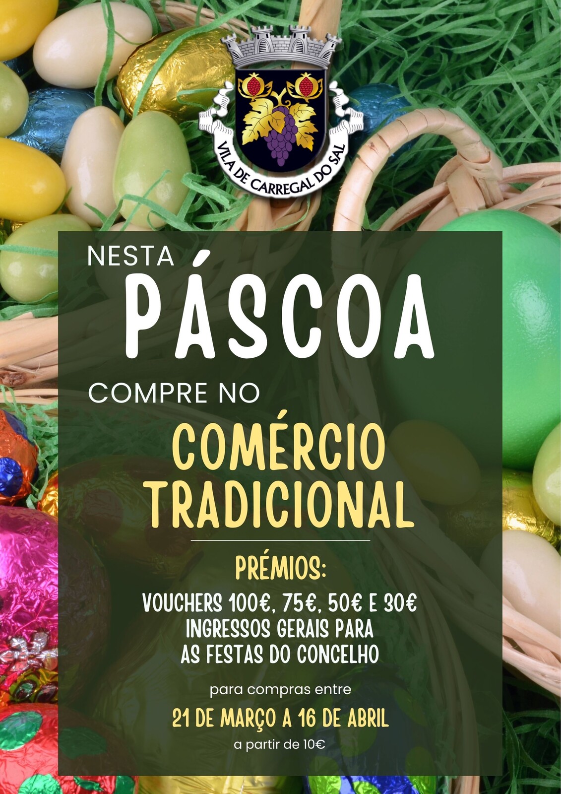 A ação “Páscoa no Comércio Tradicional”, promovida pela Câmara Municipal de Carregal do Sal leva a cabo mais uma ação de dinamização e apoio ao comércio tradicional, premiando os consumidores que fizerem compras nos estabelecimentos aderentes com sede social no território concelhio.