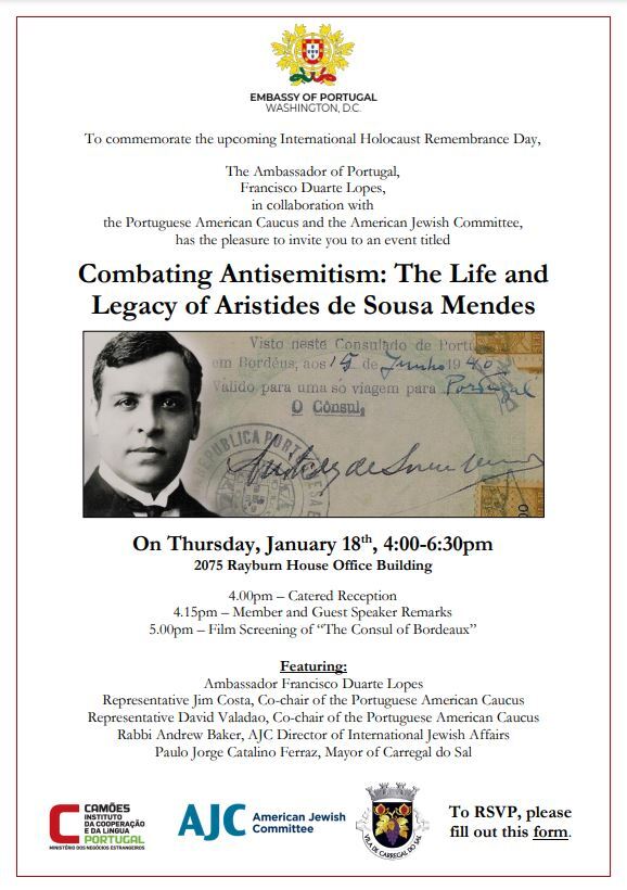 O motivo da deslocação foi um evento organizado no passado dia 18 de janeiro pela Embaixada de Portugal, no âmbito das comemorações do Dia Internacional em Memória das Vítimas do Holocausto, intitulado “Combater o antissemitismo: a vida e o legado de Aristides de Sousa Mendes”. O evento, aberto ao público, contou com a colaboração do Portuguese-American Caucus e do American Jewish Committee e, decorreu no Congresso Federal norte-americano. Compareceram vários congressistas, assim como vários representantes da comunidade judaica, entre outros, havendo a sublinhar a presença dos copresidentes do Portuguese-American Caucus, Jim Costa e David Valadao e, do Rabbi Andrew Baker, Diretor-Adjunto para as Relações Internacionais no American Jewish Committee.