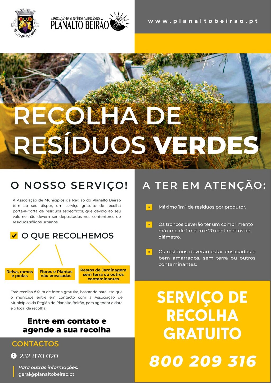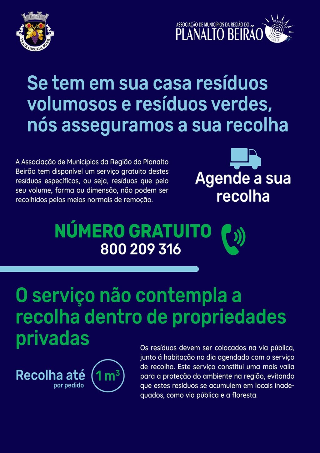 É disponibilizado um número verde grátis, específico para o efeito - 800 209 316, que deverá utilizar para fazer o agendamento, garantindo que todos os resíduos volumosos e específicos sejam recolhidos e devidamente encaminhados para o seu competente tratamento.