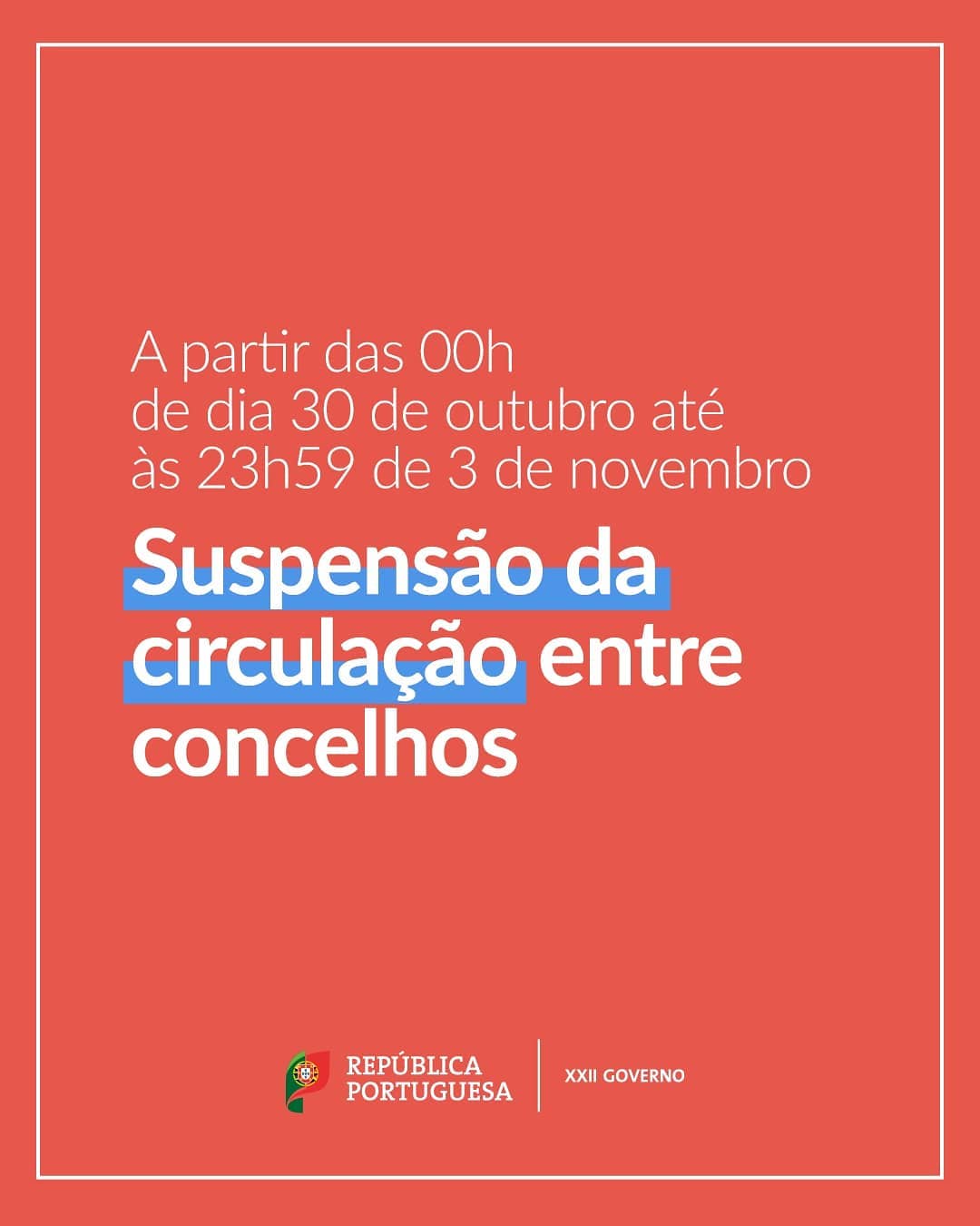 Assim, entre as 00h00 do dia 30 de outubro e as 23h59 do dia 3 de novembro, a circulação entre diferentes concelhos do território é restrita. Exceção para as deslocações em contexto de trabalho sendo que é necessária uma declaração da entidade empregadora caso a residência do trabalhador não coincida com o concelho do local de trabalho.