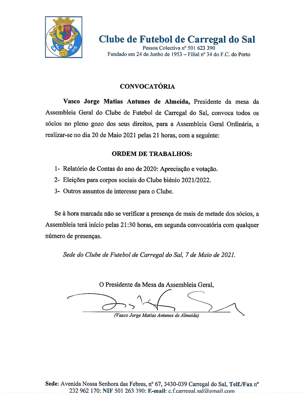 Reunião ordinária da Assembleia Geral do Clube de Futebol de Carregal do Sal