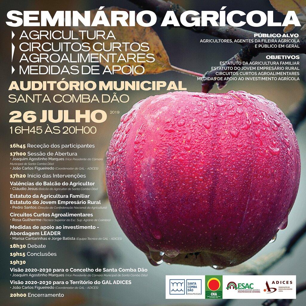 Promovido pela ADICES, em parceria com o Município de Santa Comba Dão, a Escola Superior Agrária de Coimbra (ESAC) e a Confederação Nacional de Agricultura (CNA), o evento é de participação livre e destina-se a agricultores, agentes da fileira agrícola e todos os interessados na vasta área da agricultura.