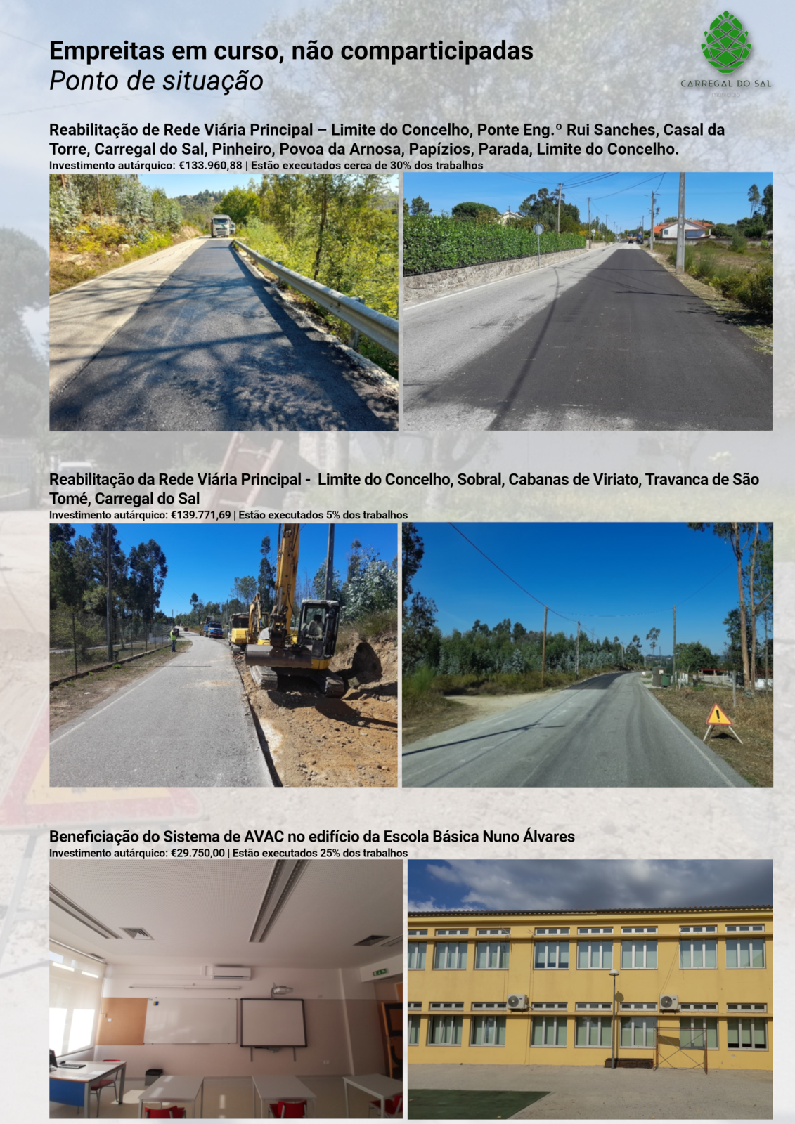 - Reabilitação de Rede Viária Principal – Limite do Concelho, Ponte Eng.º Rui Sanches, Casal da Torre, Carregal do Sal, Pinheiro, Póvoa da Arnosa, Papízios, Parada, Limite do Concelho. A empreitada foi adjudicada à empresa A M Cacho & Brás, Lda, pelo montante de €133.960,88. Até então estão realizados cerca de 30% dos trabalhos;